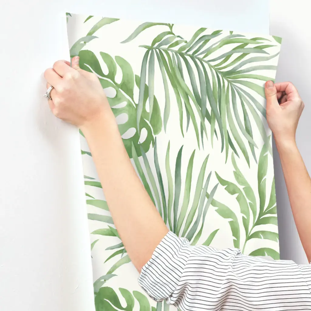 The languorous mood of the tropics comes alive with Paradise Palm Wallpaper featuring life-size leaves that seem to rustle in the breeze pleasantly cooling the noon day sun. This Paradise Palm Wallpaper measures approximately 27 inches wide by 27 feet long, covering About 60.8 square feet per roll. Printed on a heavyweight paper and created with the highest quality of craftsmanship, this wallpaper is easy to hang and removes from primed walls. Unpasted heavy weight paper material; 24-in repeat, drop match; Washable and peelable; 27-in by 27-ft long roll; Covers about 60.8 square feet