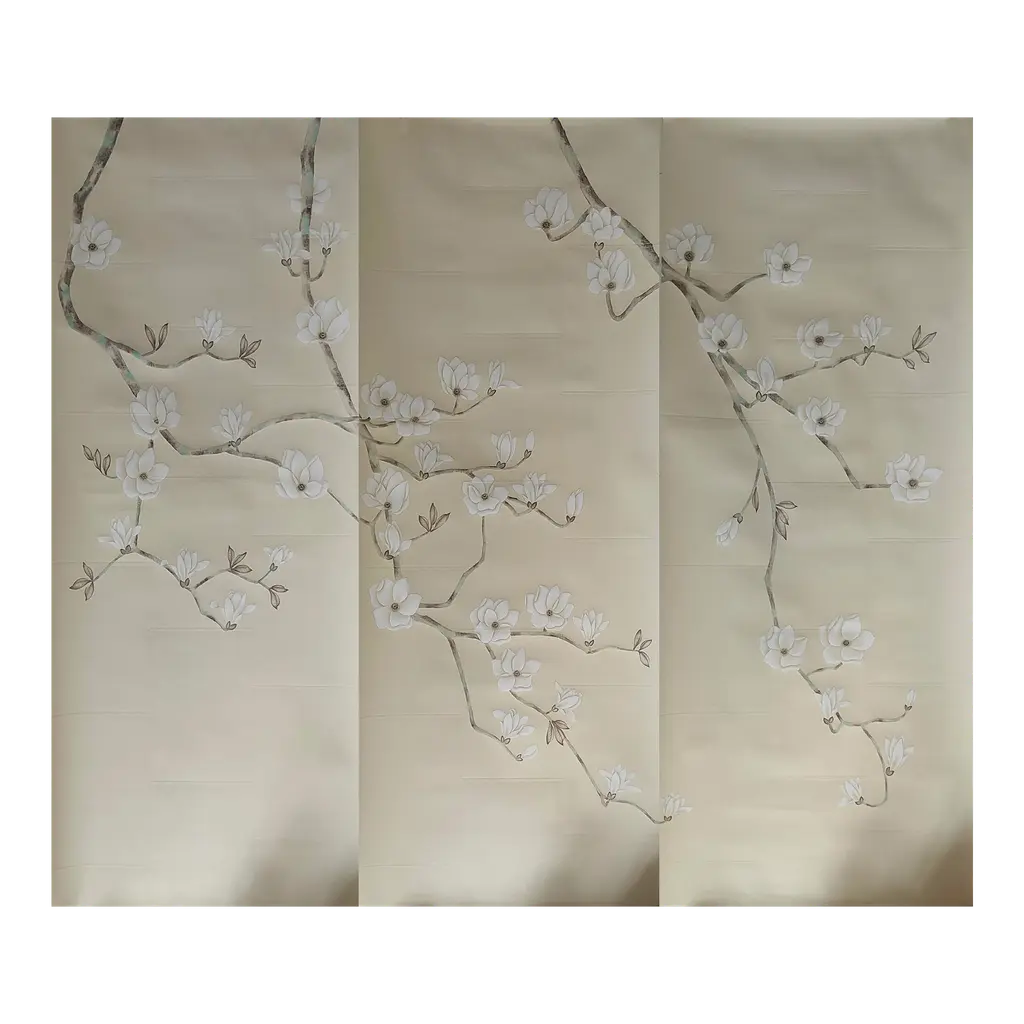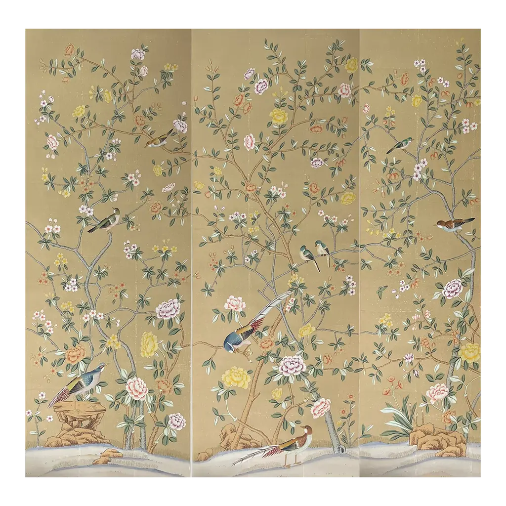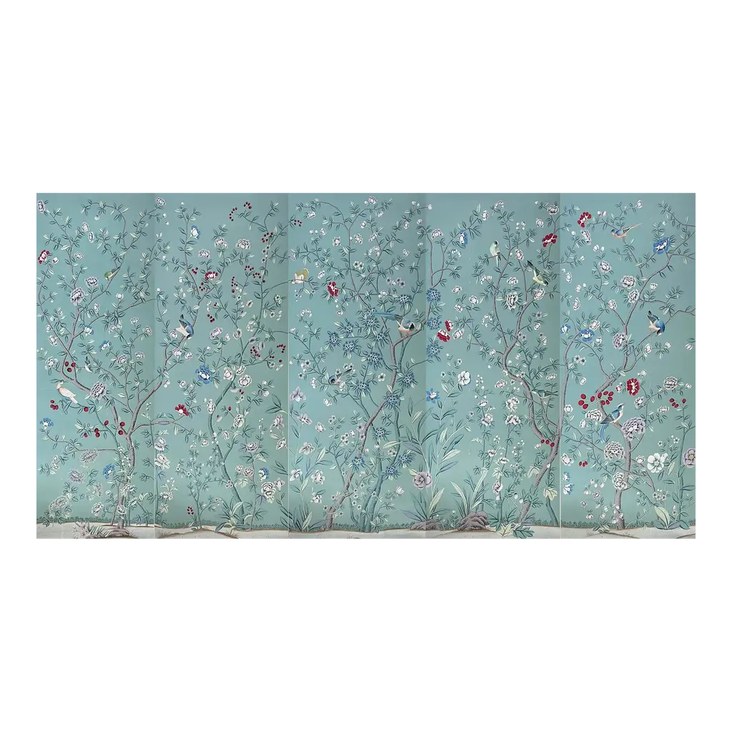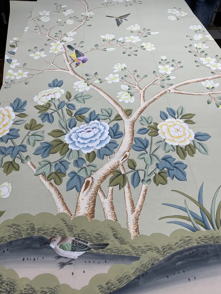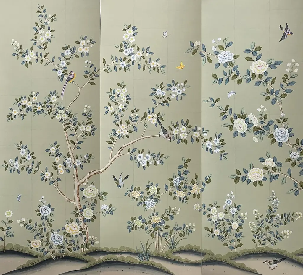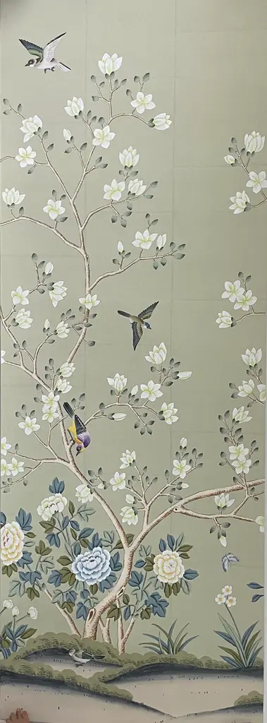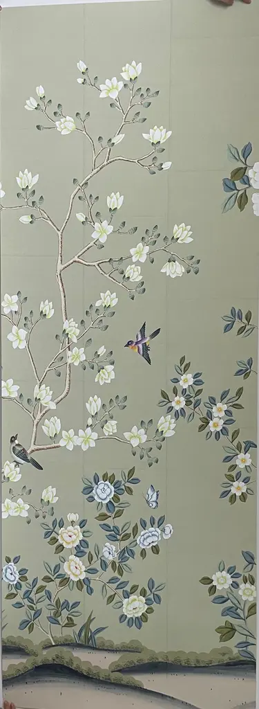 Hand Painted Chinoiserie Wallpaper On Celadon Tea Paper Panel - 2 Panels