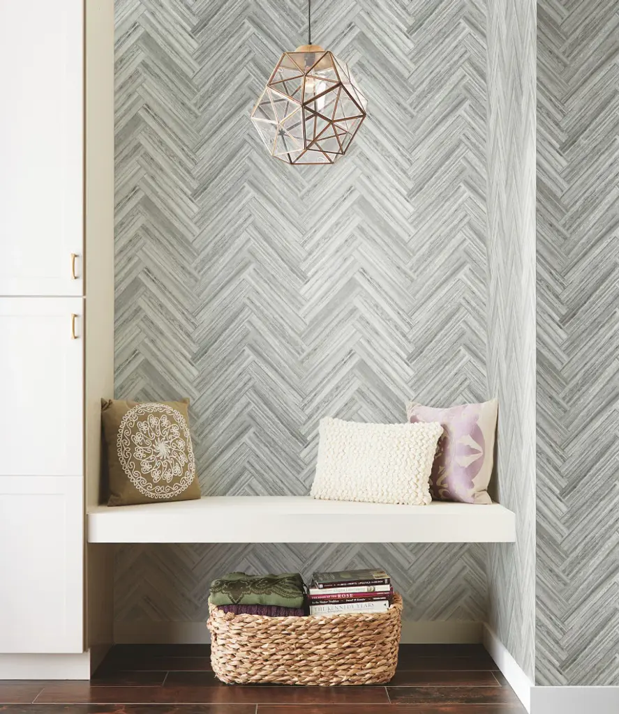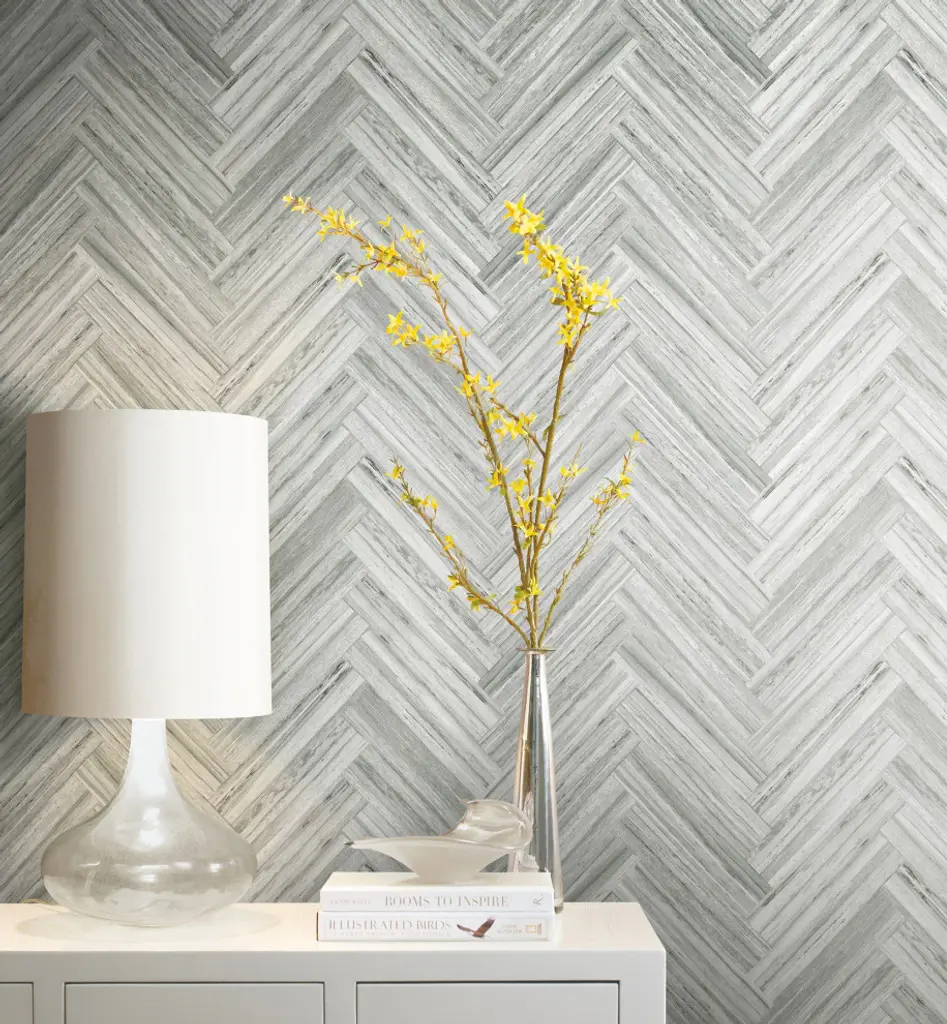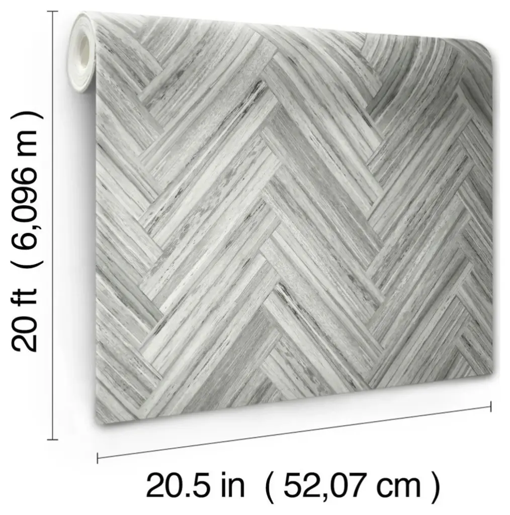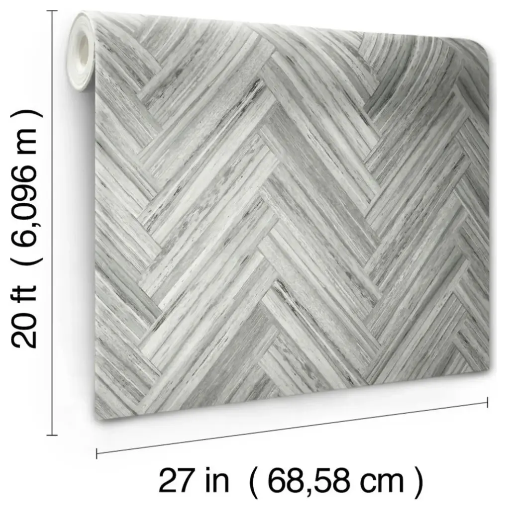 The stacked planks of pattern Hermosa Herringbone mimic raw, weathered wood repurposed in a beautiful take on a classic menswear suiting weave, shown in stonewash blue and faded gray. This blue hermosa herringbone peel and stick wallpaper measures 20.5 inches wide by 20 feet long, covering approximately 34.2 square feet per roll. The ultimate pattern inspirations for architectural finishes, motifs, and textures as found in nature. Cerused woodgrain, distinctive woven grass, cork, stone, clay, marble, and mother of pearl bring warmth and depth to surrounding spaces with familiar comfort. Peel and Stick non woven material; 20.5-in repeat, straight match; Washable and fully removable; 27-in by 20-ft long roll; Covers about 45 square feet