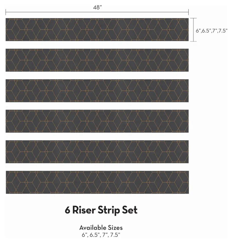 Our Hexagon Geometric Art Deco Lines Stair Riser Strips offer a beautiful and bold way to spruce up any set of stairs. DIY decorating has never been easier with this repositionable vinyl that can be easily applied and removed without any stress or mess!This re-positionable wallpaper is designed and made in our studios in New Jersey. The designs are printed onto an adhesive-backed vinyl that can be removed, repositioned, and reused. The wallpaper does not leave residue on your walls and is ideal for DIY room makeovers without the mess and headaches of traditional wallpaper.Size:48"w x 6"h48"w x 6.5"h48"w x 7"h48"w x 7.5"h