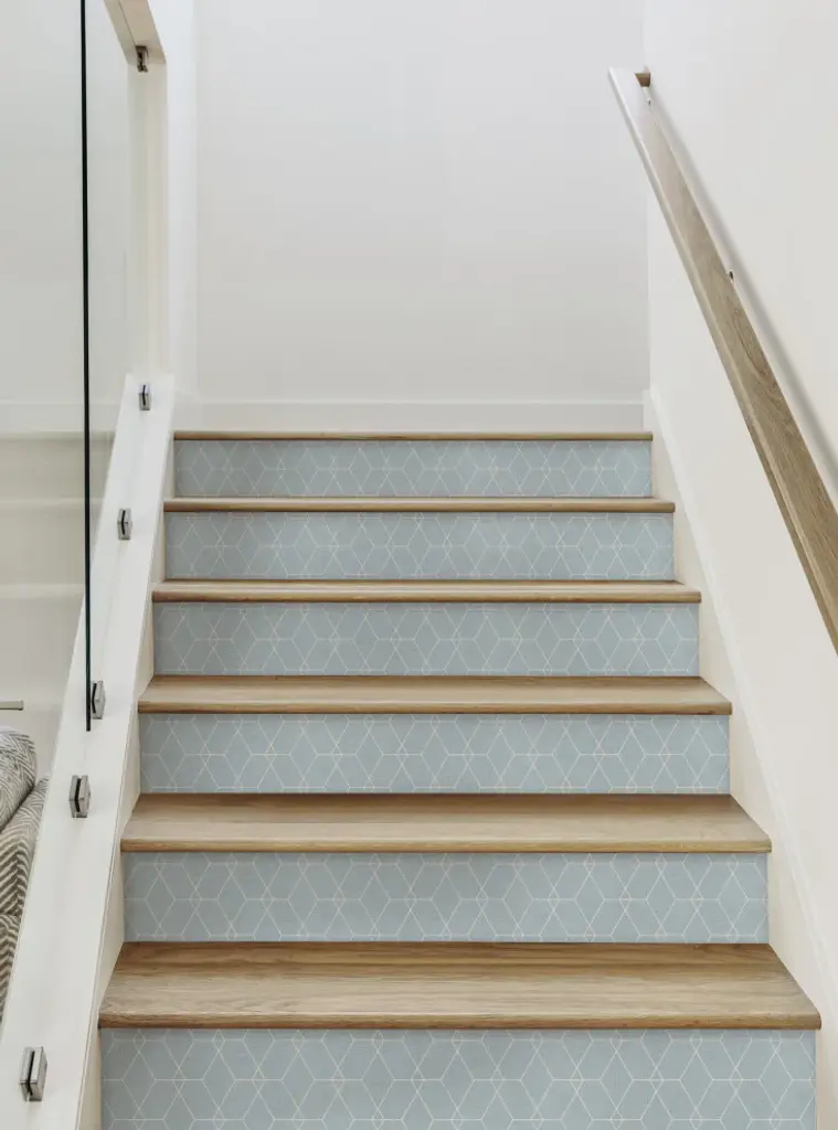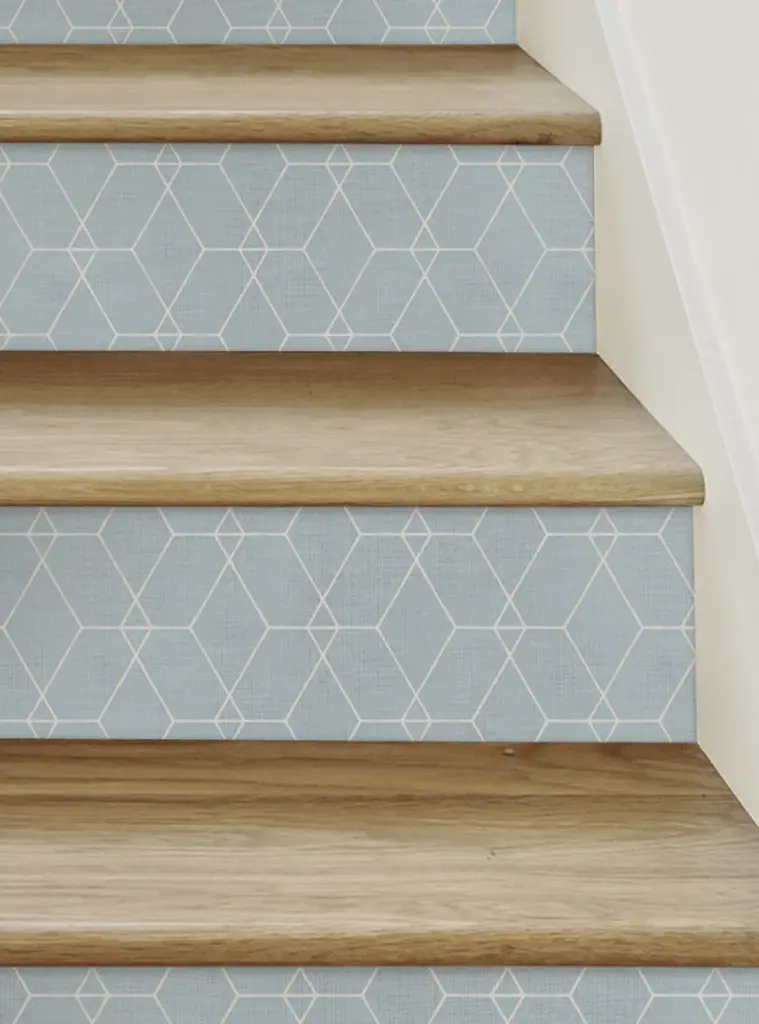 Hexagon Geometric Art Deco Lines Peel And Stick Stair Riser Strips, Light Blue, 48"w X 6"h, 6 Pack