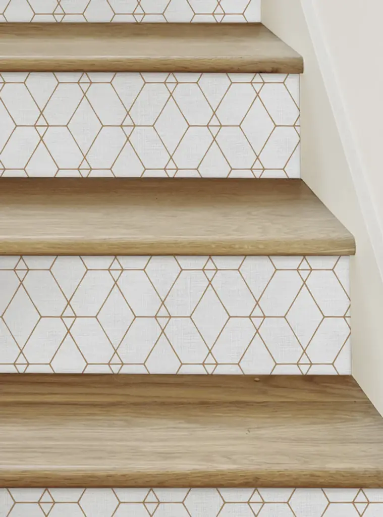 Hexagon Geometric Art Deco Lines Peel And Stick Stair Riser Strips, Off White, 48"w X 7"h, 6 Pack