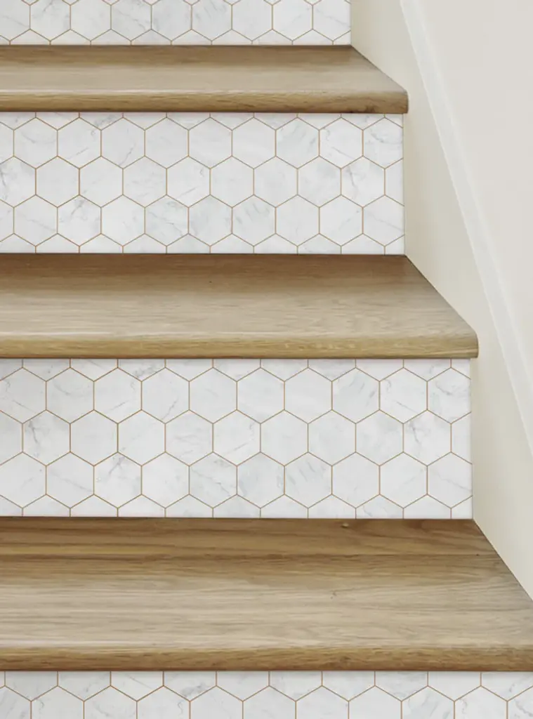 Easily create a grand staircase with your Hexagon Marble Peel and Stick Stair Riser Strips! Printed on premium adhesive backed vinyl, this geometric design will accentuate your staircase and add a touch of class to any room. DIY decorating has never been easier with this repositionable fabric that can be easily applied and removed without any stress or mess!This re-positionable wallpaper is designed and made in our studios in New Jersey. The designs are printed onto an adhesive-backed vinyl that can be removed, repositioned, and reused. The wallpaper does not leave residue on your walls and is ideal for DIY room makeovers without the mess and headaches of traditional wallpaper.Size:48"w x 6"h48"w x 6.5"h48"w x 7"h48"w x 7.5"hWhat''s Included1 sheet of peel-n-stick vinyl stair riser strip