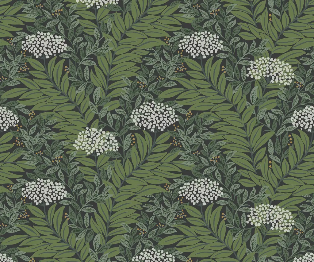 Highgrove is a traditional design featuring layered leaves that create a lush tapestry of greenery, accented by sprays of Queen Anne's Lace. This wallpaper is gravure printed and comes in 27 inch rolls with a 24 inch repeat. Due to the printing process, there may be color variations in different print runs. We suggest purchasing all wallpaper needed for a project at one time for the best color consistency. Unopened rolls can be returned.