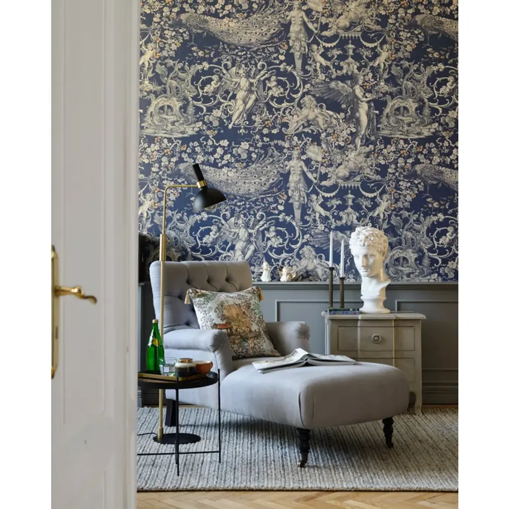 Inspired by antique illustrations of fairies and angels, The promise land is depicting an imaginary world with impressive celestial beings and large-scale ornaments. Part of the Imaginarium collection, this design is created on 3 rolls for maximizing the pattern repetition. The design is printed over 3 panels.