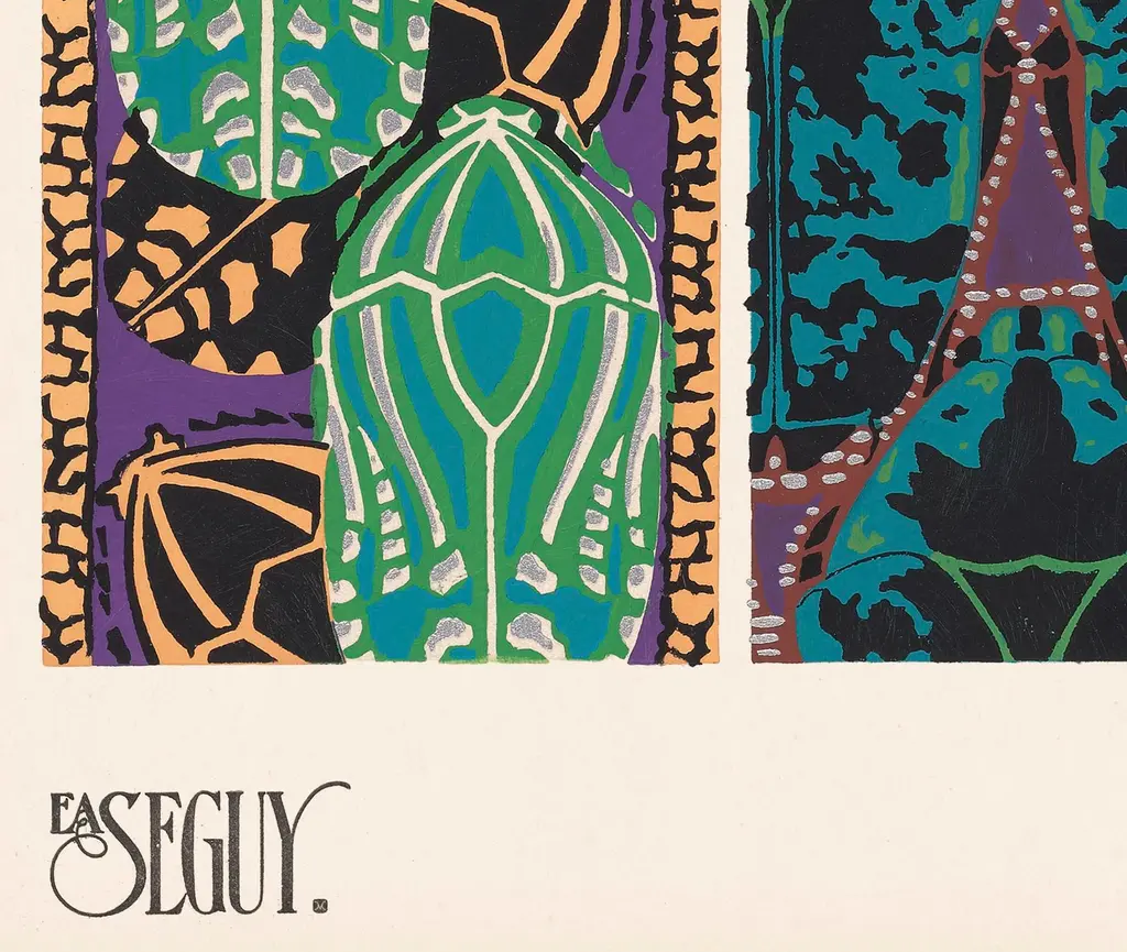 We are thrilled to present the exquisite Séguy Insects #18, available exclusively on Chairish, in the standard 14x18-inch size from CFA Editions. This offer features a beautifully crafted giclée reproduction, printed at ultra-high resolution on premium, acid-free, textured cotton rag paper imported from the renowned St. Cuthberts Mill in Wells, located in the southwest of England. With a legacy of papermaking dating back to the 1700s, St. Cuthberts Mill is celebrated for its exceptional craftsmanship. Printed using archival inks with a lightfastness rating of 200 years, this artwork guarantees vibrant, lasting colors, making it the finest reproduction available. Each print is designed to capture the essence of an original antique, complete with the character and charm of aged details. From the darkened edges that evoke years of handling and study to the subtle specks and imperfections of the original, this reproduction preserves the timeless beauty of its historic inspiration. The artist behind this masterpiece, Émile-Allain Séguy, was a French designer and artist celebrated for his groundbreaking contributions to the decorative arts and pattern design during the Art Deco period. Born on September 22, 1877, in Paris, France, and active until his passing in 1937, Séguy was a pioneer in blending natural motifs with geometric patterns and bold, vibrant colors. Séguy’s most iconic work, Insects, is a stunning series of illustrations that meticulously depict different insects in symmetrical, visually captivating compositions. His extraordinary ability to capture the essence of nature in intricate patterns and rich palettes solidified his reputation as a master of Art Deco design. Over his prolific career, Séguy applied his talents to wallpapers, textiles, book covers, and decorative arts, often inspired by the flora and fauna that defined his unique artistic vision. Séguy’s legacy continues to influence artists and designers, with his work celebrated for its creativity, sophistication, and timeless appeal. Be sure to explore our other listings to discover the complete series of 20 stunning images from Insects by Émile-Allain Séguy.