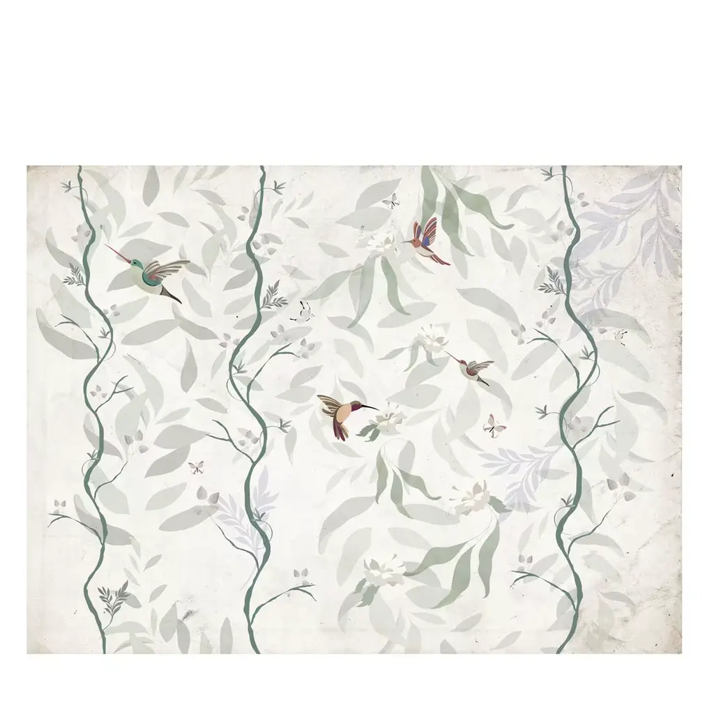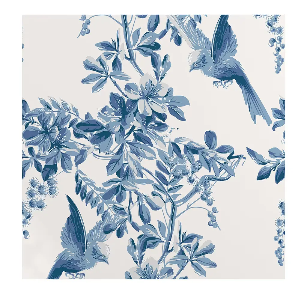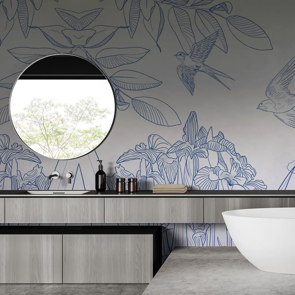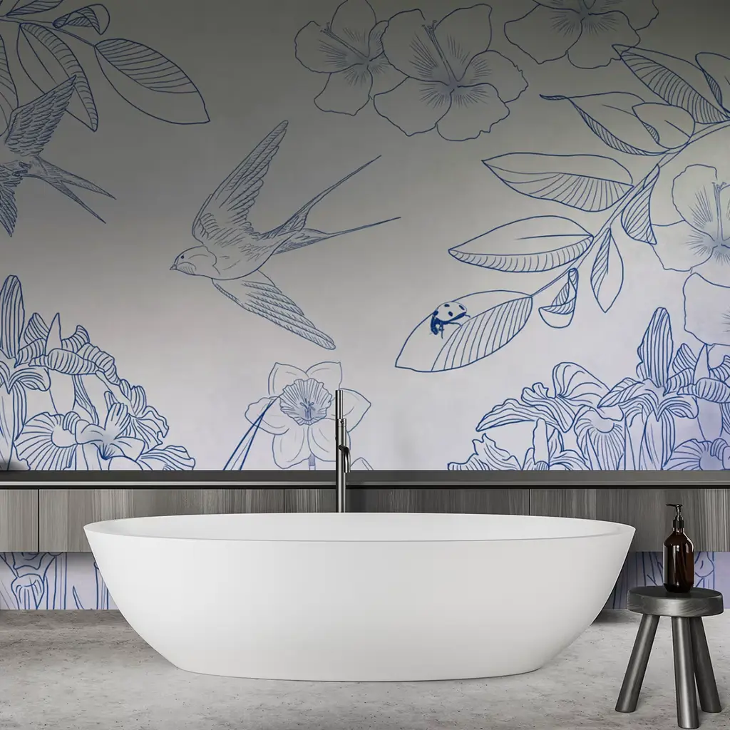 A clean and elegant representation of swallows, flowers, leaves, and a ladybug in stunning blue lines, this exquisite wallpaper will uniquely adorn a modern interior. Composed of a cellulose base, textile fibers, and a vinyl surface, it is fireproof, unscented, breathable, and hypoallergenic. This design is also available in PVC-less ECO or waterproof fiberglass variants, please ask the Concierge for more information. The price is per squared meter.