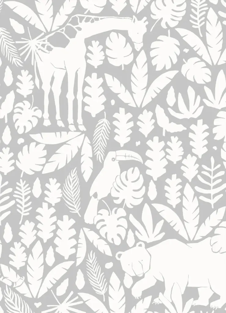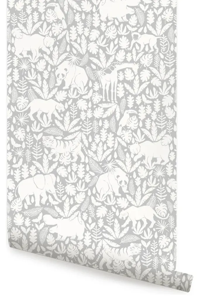 Jungle Animals Peel And Stick Vinyl Wallpaper, Cool Gray, 24"w X 108"h