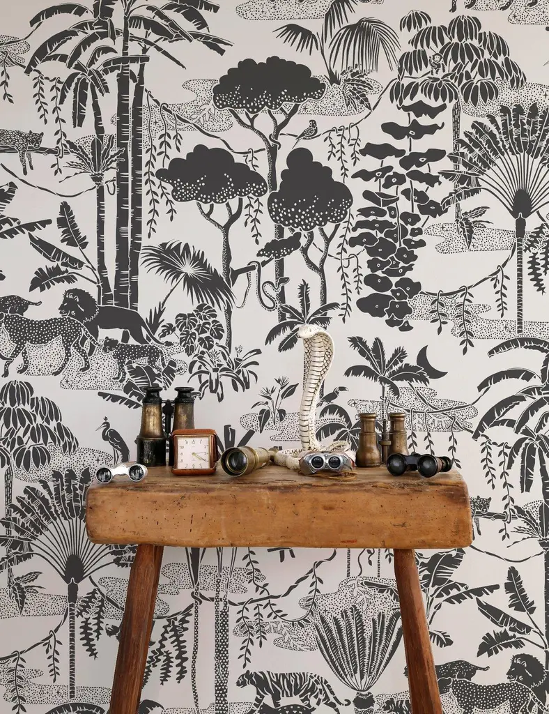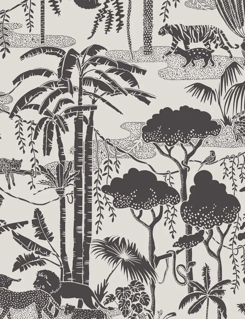 Jungle Dream Designer Wallpaper In Color Newsprint 'Black And Warm Neutral'