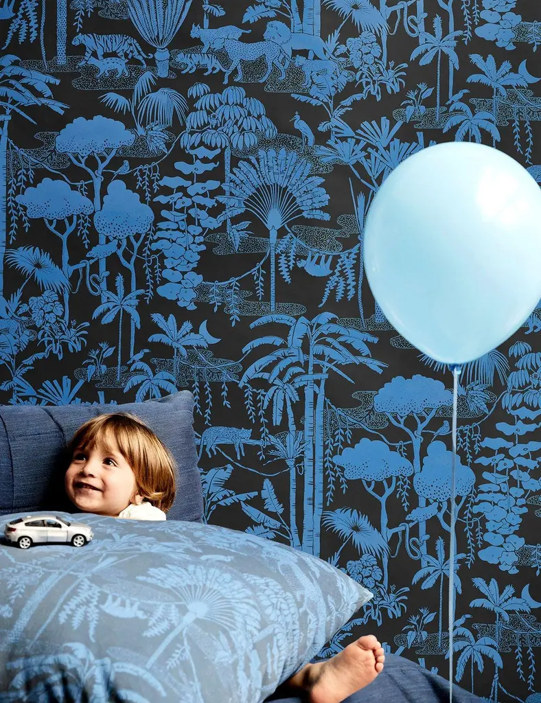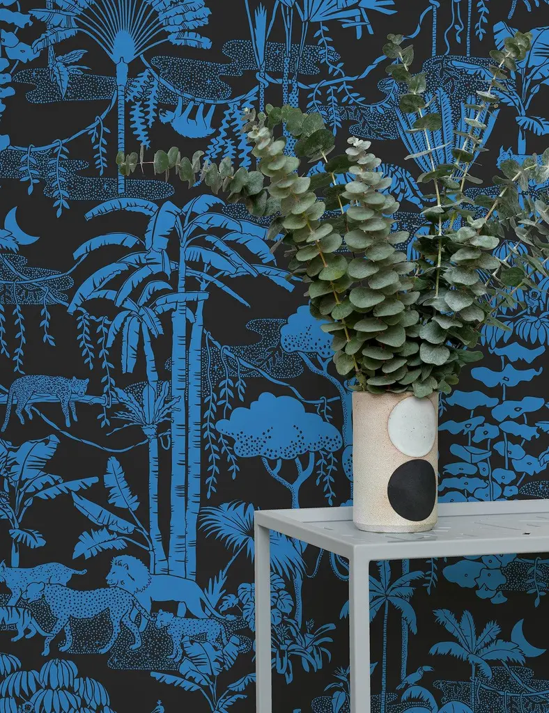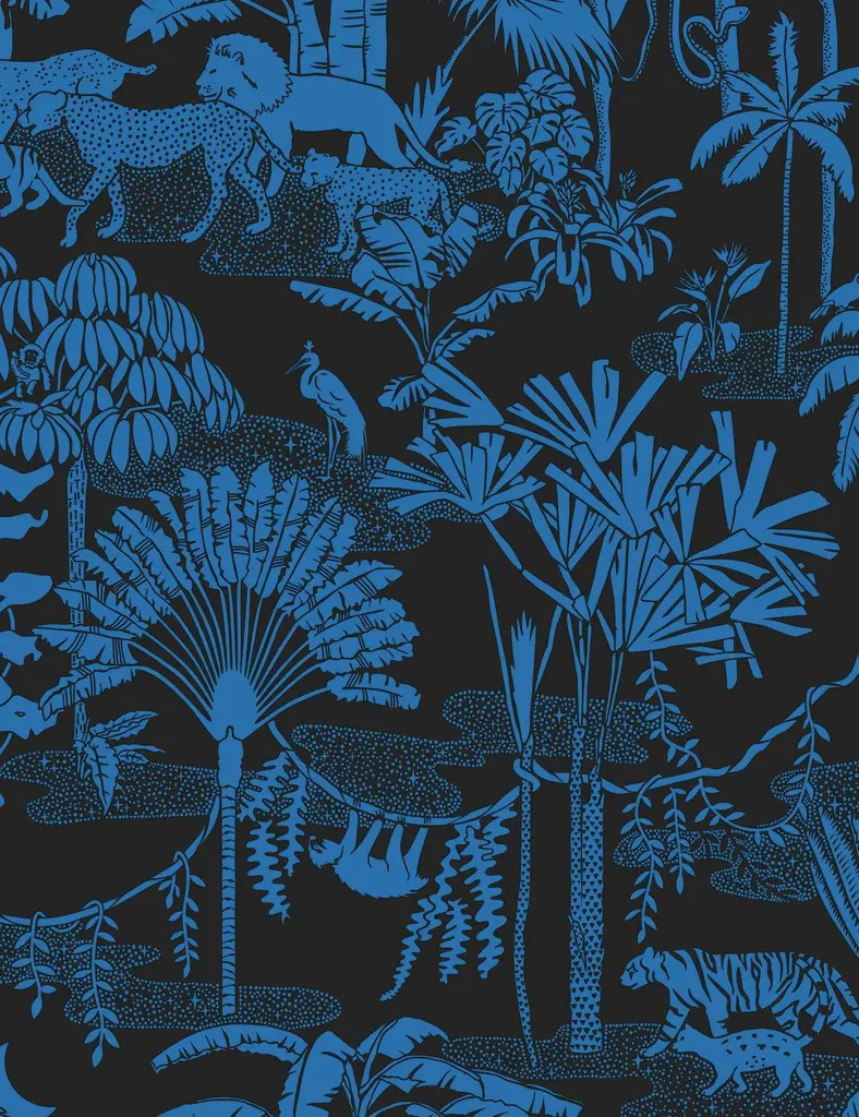 Jungle Dream Designer Wallpaper In Mediterranean 'True Blue And Black'