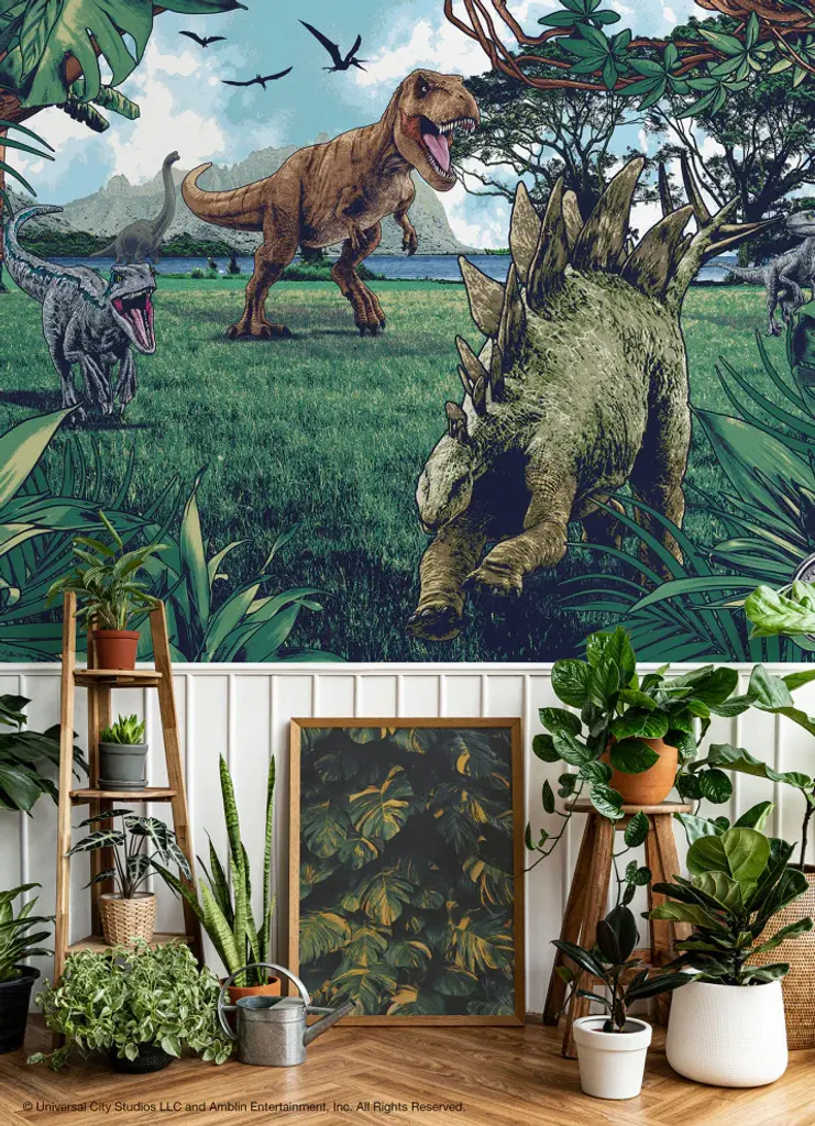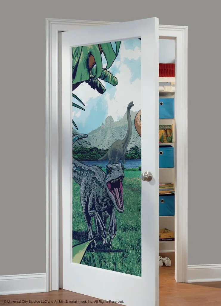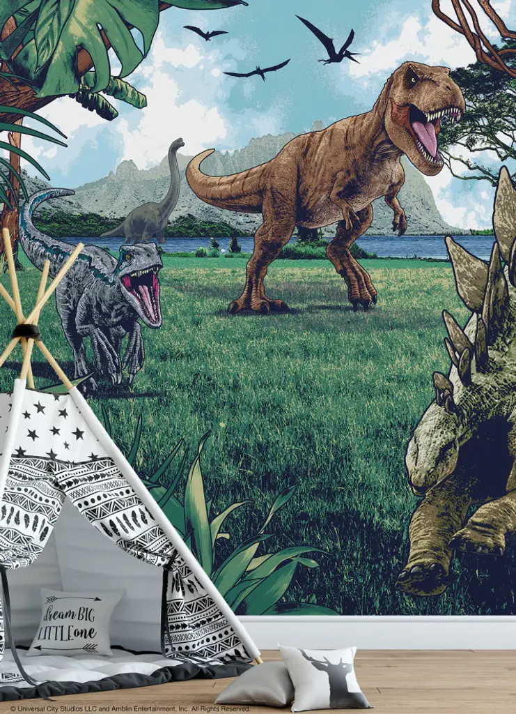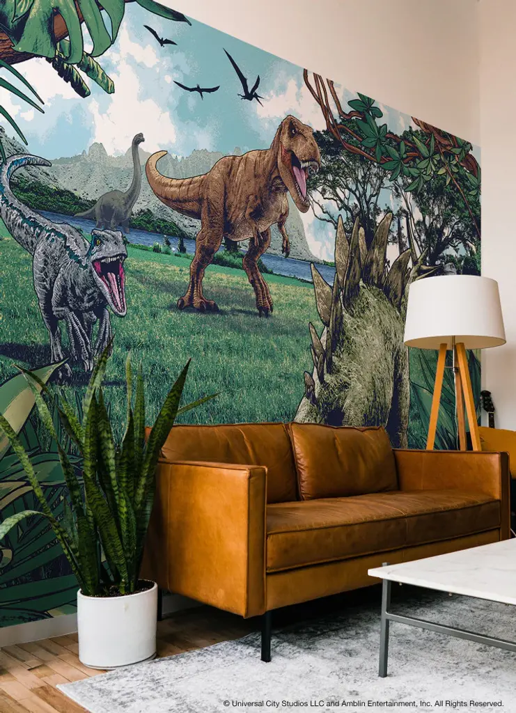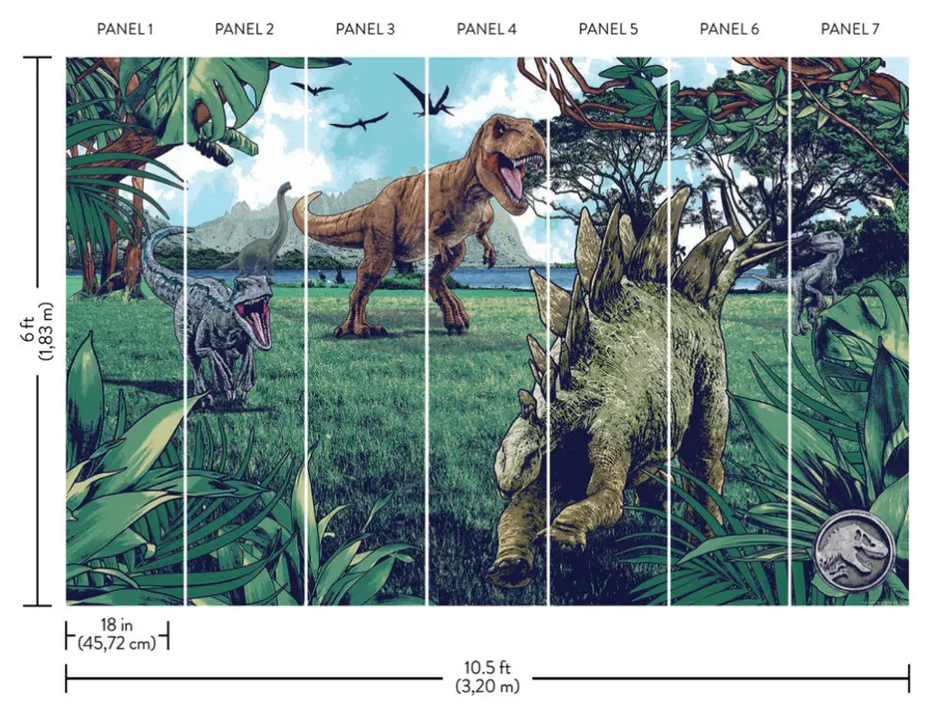 Fans of Jurassic Park will absolutely love this officially licensed Jurassic Park peel and stick wallpaper mural! Featuring a T. Rex, Velociraptor, and a Stegosaurus, this wallpaper mural is the perfect way to display your love for Jurassic Park in any space. This mural comes on 7 panels on 7 sheets that come together to form the entire mural. Installation is as simple as Peel, Stick, Done! Jurassic Park Peel and Stick Mural Peel and Stick Mural contains 7 pieces on 7 sheets that measure 84 inches x 18 inches. Officially-licensed Jurassic Park peel and stick wallpaper mural featuring dinosaur imagery from the hit film series. ; Measures 10-ft 5-in tall by 7-ft wide when assembled; Comes in 7 sheets; Peel and stick to apply, pull up to remove; Safe for walls, leaves no sticky residue behind; Sticks to any smooth, flat surface; This product should NOT be applied to textured walls-smooth clean, dry, painted surface only (no Non-Stick paint or soap residue).