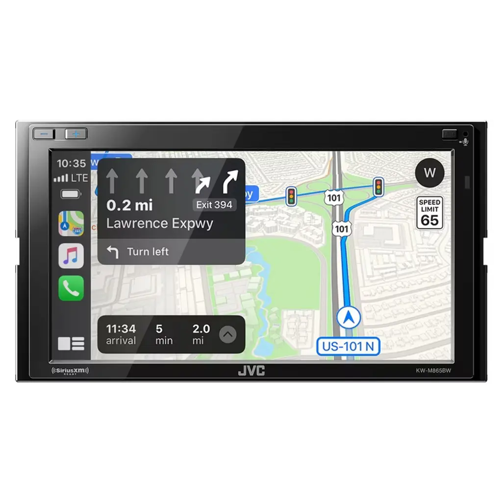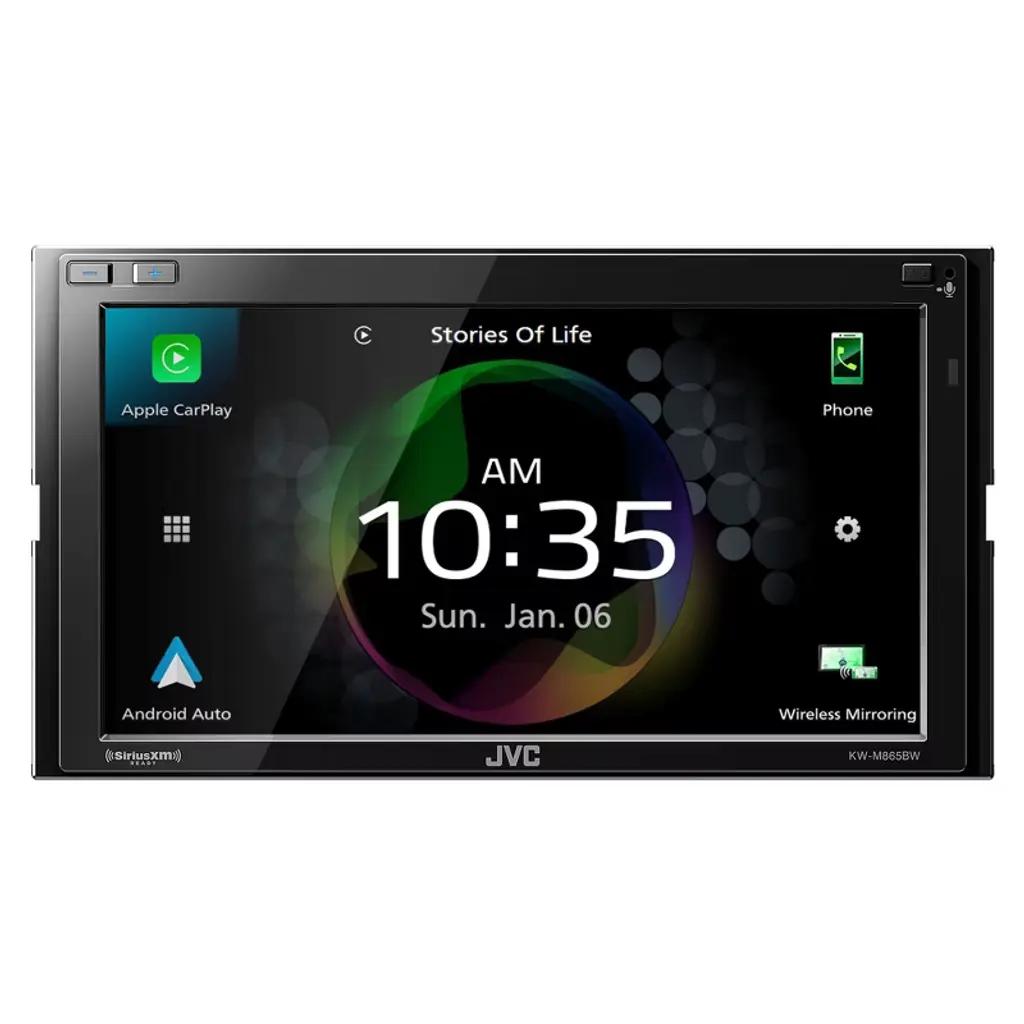 JVC KW-M865BW Digital Media Receiver featuring 6.8" Clear Resistive Touch Monitor / Wireless Apple CarPlay / Wireless Android Auto / 4-Cam Input / High-Resolution Audio / iDatalink Maestro Ready / Bluetooth® / 13-Band EQ CarPlay And Android Auto over Wi-Fi! Make and receive phone calls, listen to your favorite music, all with less intrusion so you can drive safely. Enjoy your apps, and view Maps, on the receiver’s big screen. CarPlay is a safer way to use your iPhone in the car. Simply talk to Siri or touch the receiver’s display and get directions from Map, make phone calls, listen to voicemail, send and receive texts, and listen to music all in a way that allows you to stay focused on the road. Specifications - Monitor • Screen Size: 6.8"W VGA Screen • Touch Panel: Clear Resistive • Monitor Touch Control: Yes • Customizable GUI: Yes • Key Illumination Color: Blue • Dimmer: Yes • Multilingual Display: Yes[4] • Wallpaper Capture: Yes • Live Wallpaper: Yes Bluetooth Control • Built-in Bluetooth[1]: Yes (Version 5.0, Wired-Mic included) • Hands Free Call: Yes (HFP1.7 Wideband Speech) • 2 Phones Full-Time Connection: Yes Wi-Fi Control • Built-in Wi-Fi: Yes • Android Auto[2]: Yes (via Wi-Fi or USB) • Mirroring for Android: Yes (via Wi-Fi or USB*) *via USB : Need mirroring App • CarPlay[3]: Yes (via Wi-Fi or USB) • Mirroring for iPhone: Yes (via USB) *Need mirroring App • USB Port: x 2 (High Speed) • SiriusXM Ready: Yes (Tuner required, sold separately) • Radio Broadcast Data System (RBDS): Yes • Preset Stations: 20(FM:15ch, AM:5ch) • EQ: Yes (13-Band Graphic EQ) • High-Pass Filter/Low-Pass Filter: Yes/Yes • 3-Way X'over: Yes • High-Resolution Audio: Yes • Time Alignment: Yes • Video Out: RCA • Rear view camera Input: Yes • Front view camera Input: Yes • 3rd Camera Input: Yes • Line Output Terminals: 3 Pairs (Front + Rear + Subwoofer) • Pre-output Level/Impedance: 5.0V / 10k ohms