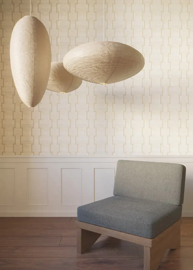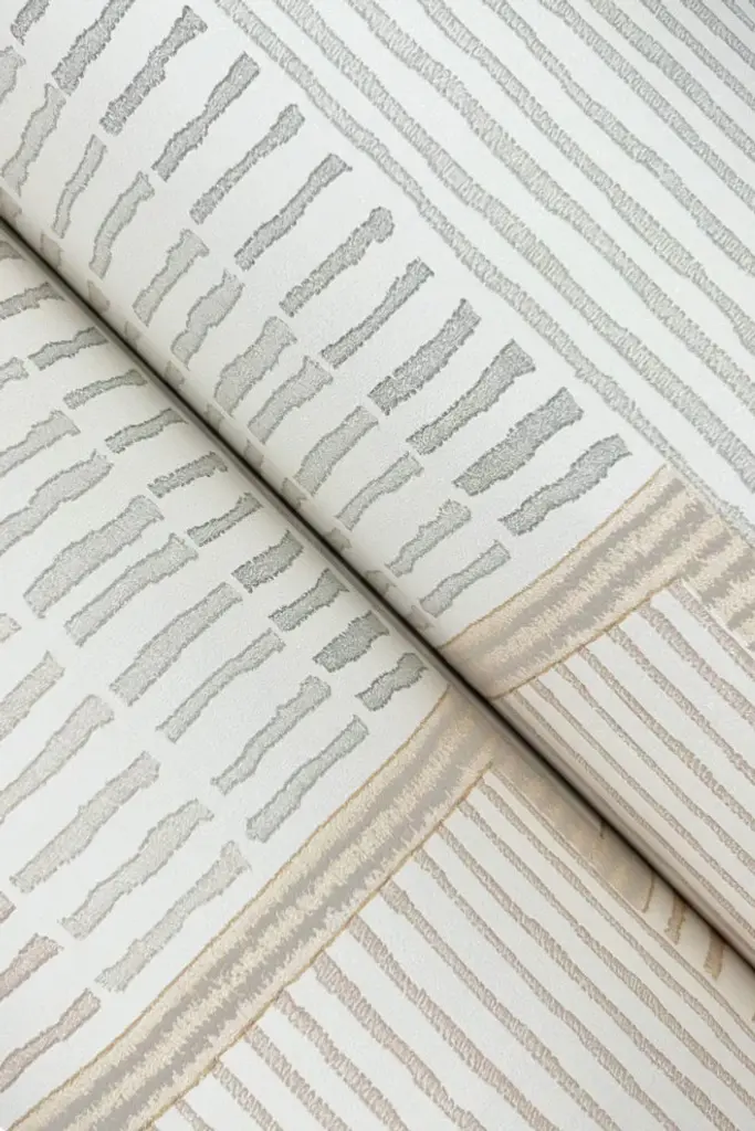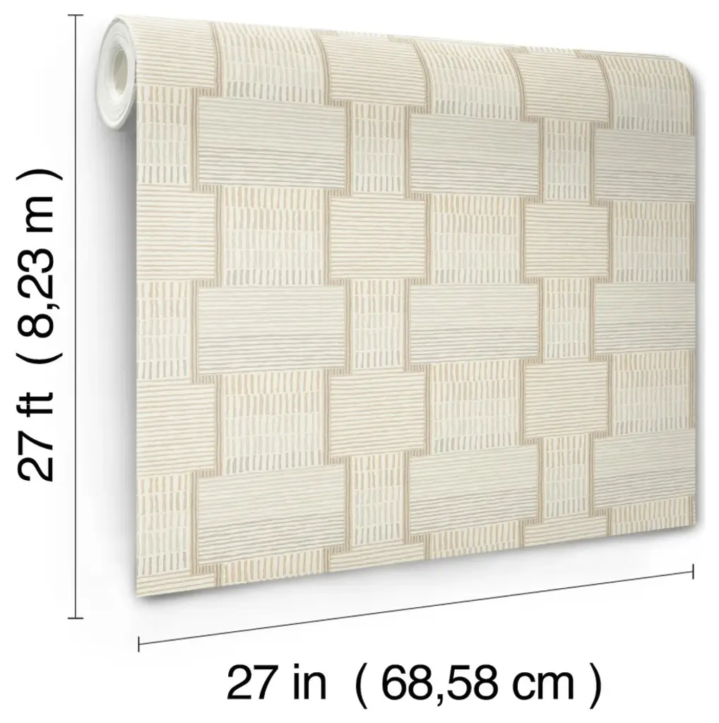 Diminutive overlock stitches outline and enhance the geometric embroidered trims that inspired La Broderie, shown in fawn beige and dove grey. This La Broderie Wallpaper measures approximately 27 inches wide by 27 feet long, measuring approximately 60.8 square feet per roll. A retrospective from the private collections of Christiane Lemieux featuring global, artistic, and handcrafted designs. Unpasted non woven material; 24-in repeat, straight match; Washable and strippable; 27-in by 27-ft long roll; Covers about 60.8 square feet