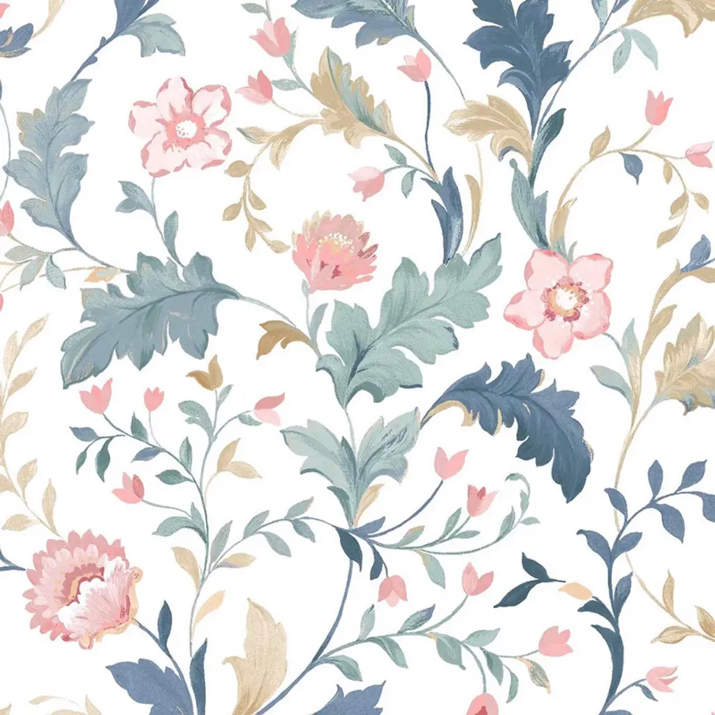 A full roll of this product is 20.5 inches wide and 396 inches long. A full roll can cover up to 56 square feet depending on the design match and pattern repeat. A sample of this product is 8 inches by 11 inches. Evoking the essence of a blooming garden, Litton is a beautiful print in an arts and crafts style featuring a delicate arrangement of soft flowers intertwined with scrolling leaves.