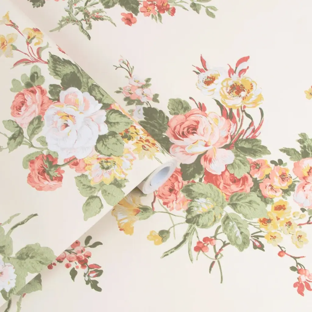 Give the delightful look of classic country charm with the Rosemore wallpaper. This striking vintage floral print was inspired by a painted antique artwork held in the Laura Ashley archive. This design features traditional British flowers on a neutral background.