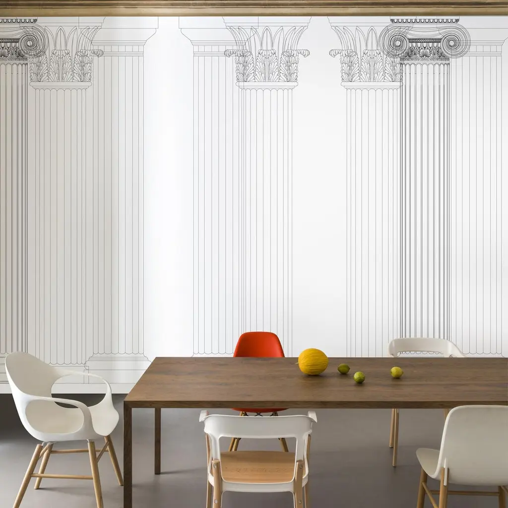 Were I, all of a sudden, to find myself lost in a dream, I would search in the horizon for the right moment to make it come true.Even if everything seems frozen in time, it’s actually moving and evolving.In this seemingly never ending time, ideas have started to grow and shape themselves: in a moment where we feel like we cannot make visions and projects come true as we are suspended in a dreamlike world, we looked for a way to make the intangible, tangible: dreams, memories, thoughts, moments and digital visions.The eclectic approach of Chiara Pellicano and Edoardo Giammarioli made this challenge possible.The results are three collections of wallpaper playing around this concept: Nebula, windows and layers.Imagining a digital past, the collection Layers elaborates several temporal and geometric juxtapositions. Classical elements like columns and capitals, in a triumph of wireframe shapes.There isn't a defined pattern for the wallpaper positioning, the project is customized on the wall. The stripes can be swapped to fit the needs of the room, choosing to have more or less glitch and where to place it.Heavy-duty wallpaper with top layer in paper, colorfast and washable with a slightly wet soft cloth.Glue must be applied to the wall and not the wallpaper.Stripes are 47cm wide.€ 294 per square meter.