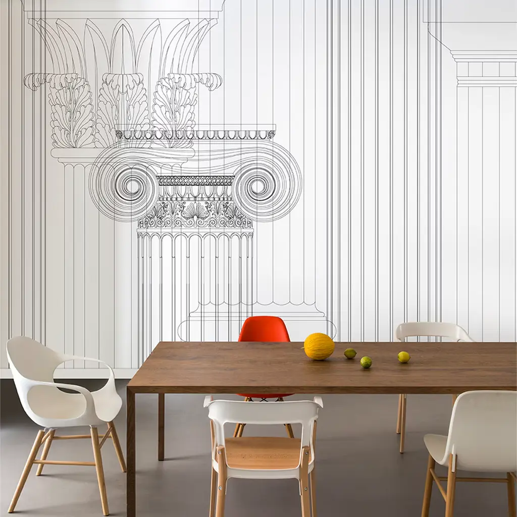 The wallpaper collection Layers elaborates on several temporal and geometric juxtapositions by imagining a digital past. Classical elements like columns and capitals, in a triumph of wireframe shapes. Design by Chiara Pellicano and Edoardo Giammarioli. Price per squared meter.
