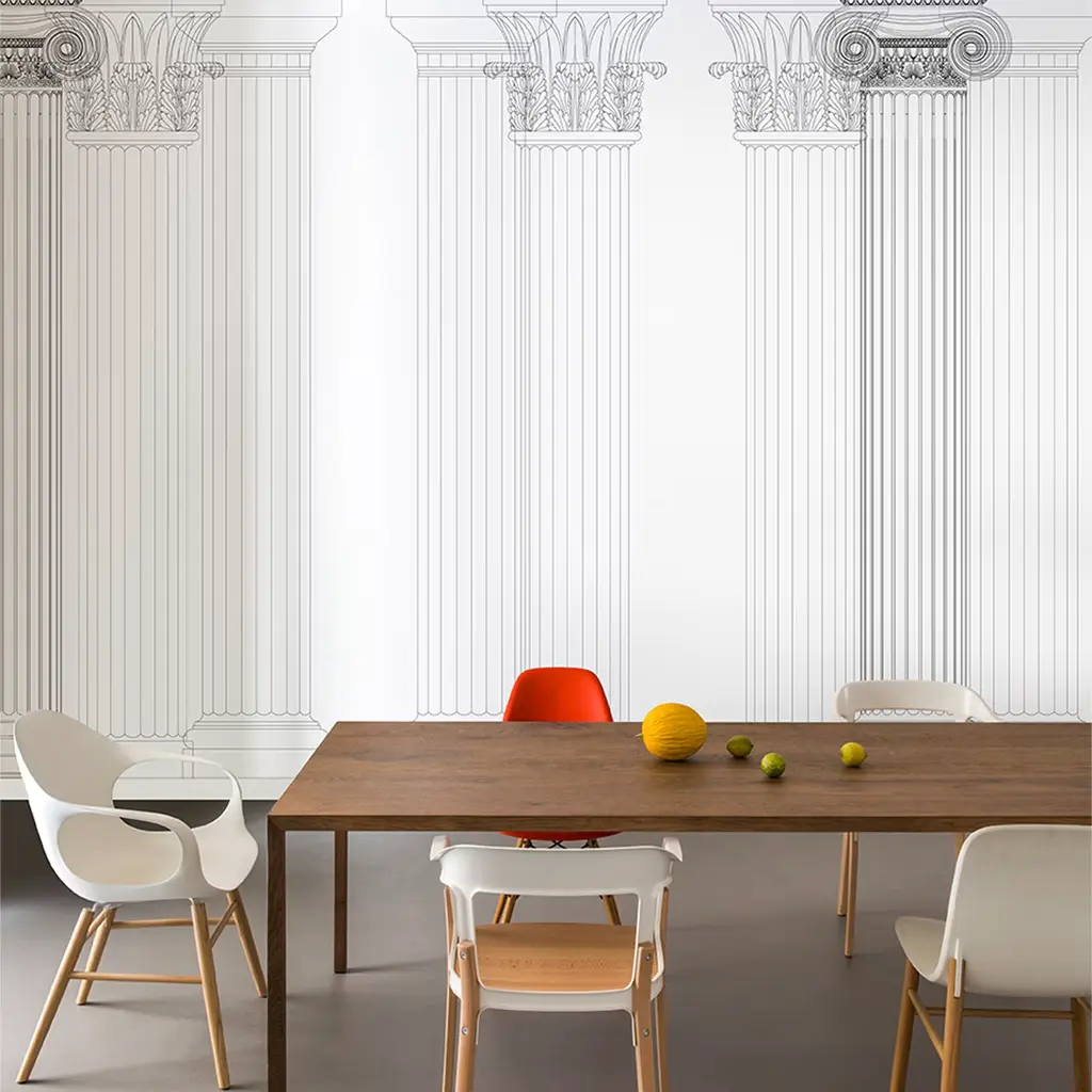The wallpaper collection Layers elaborates on several temporal and geometric juxtapositions by imagining a digital past. Classical elements like columns and capitals, in a triumph of wireframe shapes. Design by Chiara Pellicano and Edoardo Giammarioli. Price per squared meter.