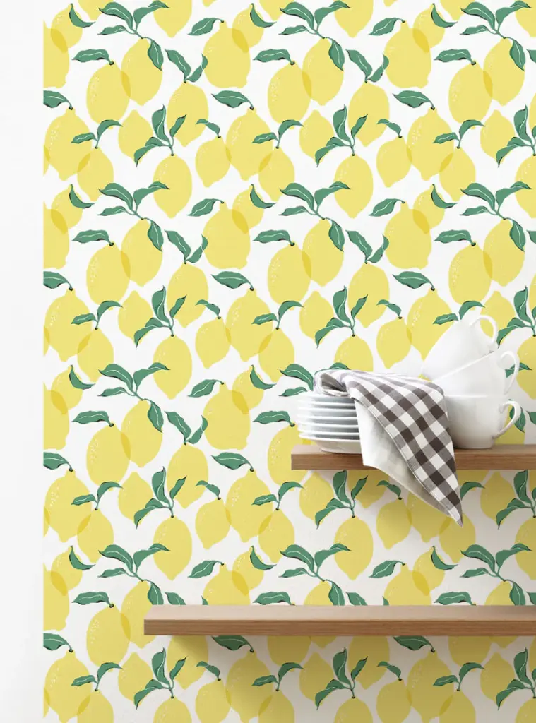 Lemon Peel and Stick Vinyl Wallpaper. This repositionable wallpaper is designed and made in our studios in New Jersey. The designs are printed onto an adhesive-backed vinyl that can be removed, repositioned, and reused. The wallpaper does not leave residue on your walls and is ideal for DIY room makeovers without the mess and headaches of traditional wallpaper.Size Options:24"w x 60"h24"w x 108"hPattern Repeat Length:every 12"What''s Included:1 sheet of peel-n-stick vinyl wallpaper