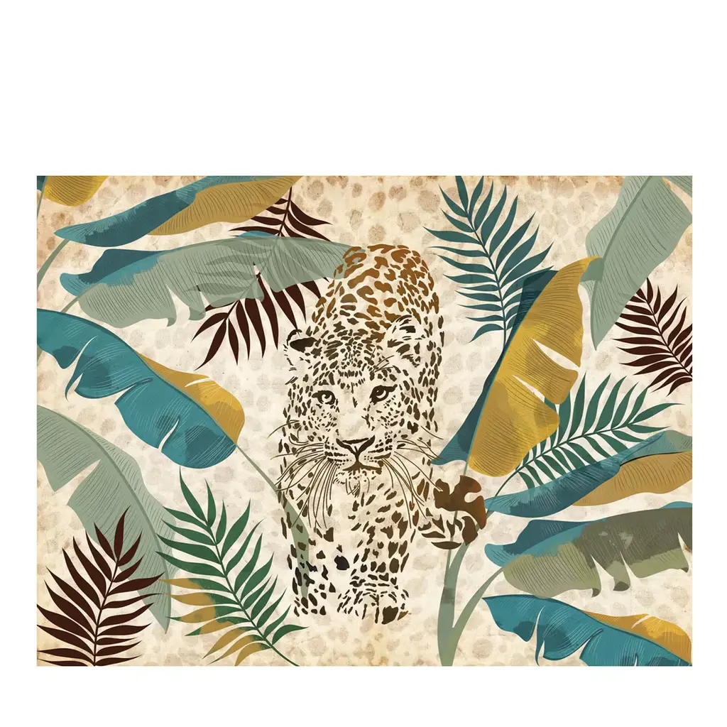 A striking and creative design to enrich an empty wall of a modern interior, this wallpaper depicts a leopard elegantly walking forward, towards a mesmerizing wilderness of brown, green, and ochre-colored leaves. Composed of a cellulose base, textile fibers, and a vinyl surface, it is fireproof, breathable, unscented, and hypoallergenic. Also available in fiberglass or PVC-free ECO variants, please ask the Concierge for details. The price is per squared meter.