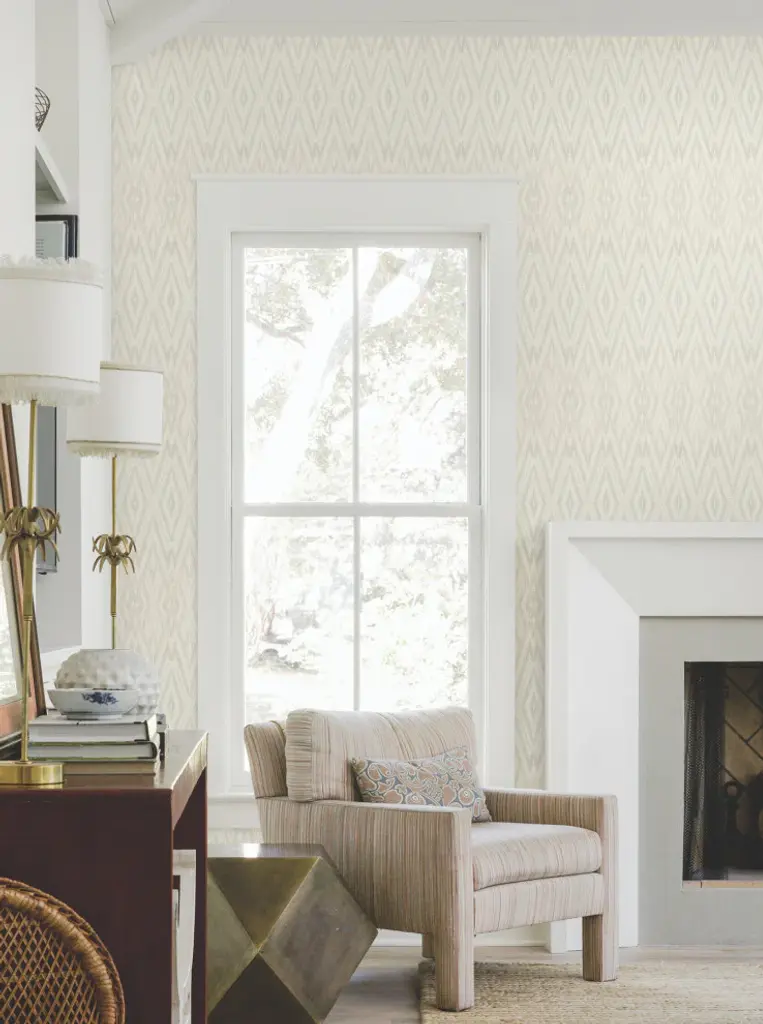 Ikat pattern Diamond Marquise weaves a cream and beige tapestry of elegance in this updated homage to the timeless charm of native handlooms. This Diamond Marquise Wallpaper measures approximately 27 inches wide by 27 feet long, measuring approximately 60.8 square feet per roll. Organic simplicity and lustrous adornment for the modern home. Unpasted non woven material25.25-in repeat, straight matchWashable and strippable27-in by 27-ft long rollCovers about 60.8 square feet