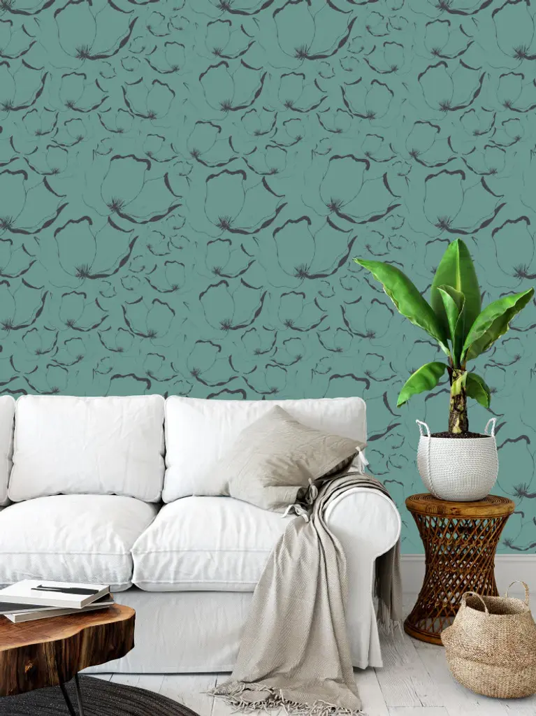 Loose Flowers Green Black Wallpaper By Monor Designs, 24"x144"