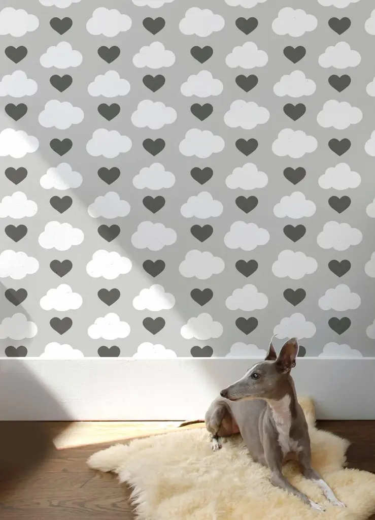 This hand-printed wall-covering is as simple as it is elegant! Hearts and clouds... the perfect wallpaper for your child's room, playroom or nursery. Samples are available for $18 including US shipping, please message us to purchase. Printing: Digital pigment print (minimum order of 4 rolls). Material: FSC-certified paper. Trimming: This product may come pre-trimmed or untrimmed. Packaging: May be shipped as double rolls, or as a combination of double and single rolls. Single roll: 27 inches × 5 yards (68.8 cm × 4.5 meters) Sample: 8 × 10 inches (20.3 × 25.4 cm) Design Repeat: 35.5 inches (90.2 cm) Design Match: Straight Size note: One cloud measures 3 inches (7.6 cm) wide Made in the USA. Ships worldwide.Commercial grade options available; please contact us for more information.