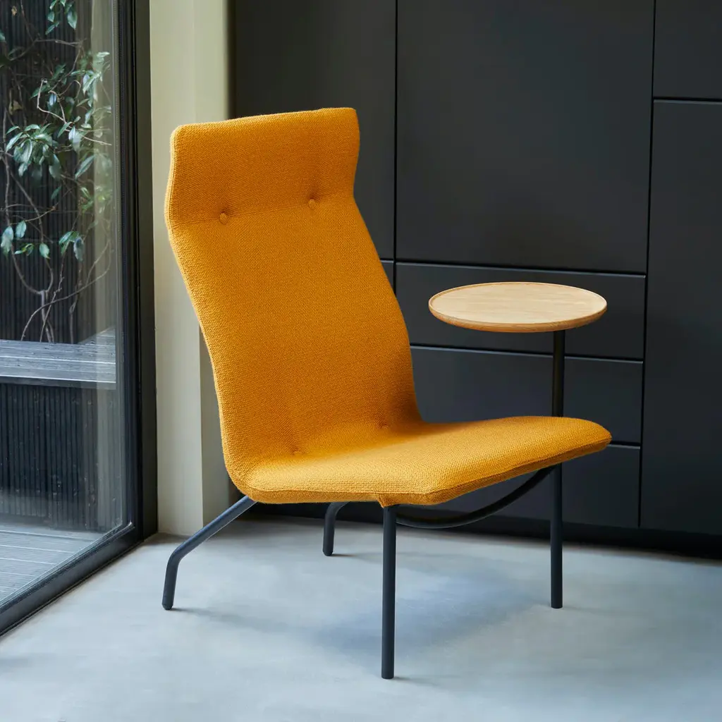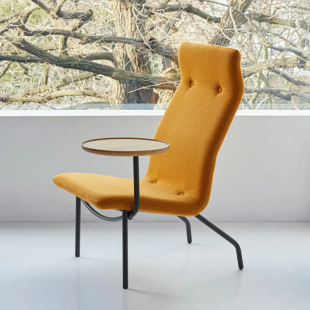 Lucio is the ideal seat to “take Zoom calls in comfort,” says Wallpaper magazine in citing its utility for working at home. Sebastian Wrong’s high-backed chair features an ergonomic foam body supported by sprung webbing that shapes to the user with ease. Ingeniously, the seat of the chair is connected to its tubular steel frame with its textile or leather cover. An optional pivoting side table holds a laptop or tablet. And, as the designer notes, “You don’t have to worry about your background or whether you’re going to end up with a sore neck.”