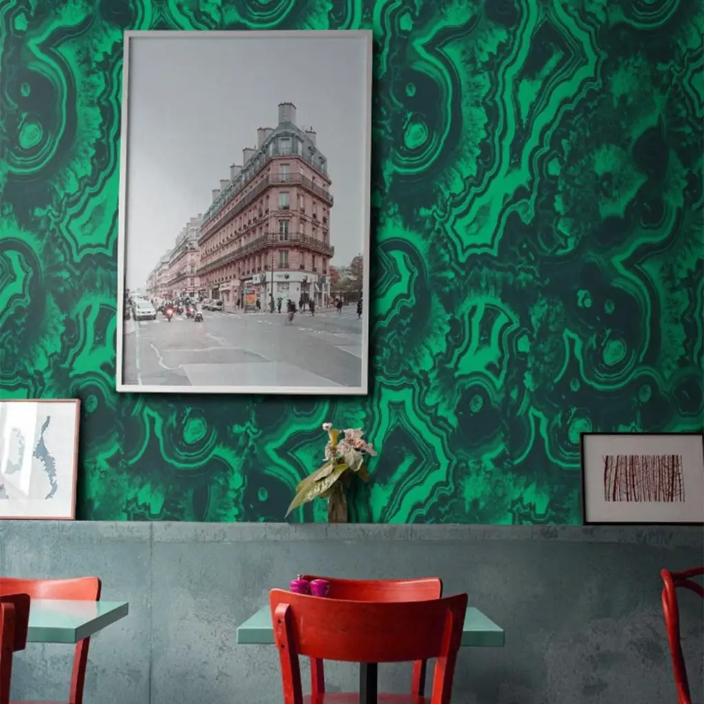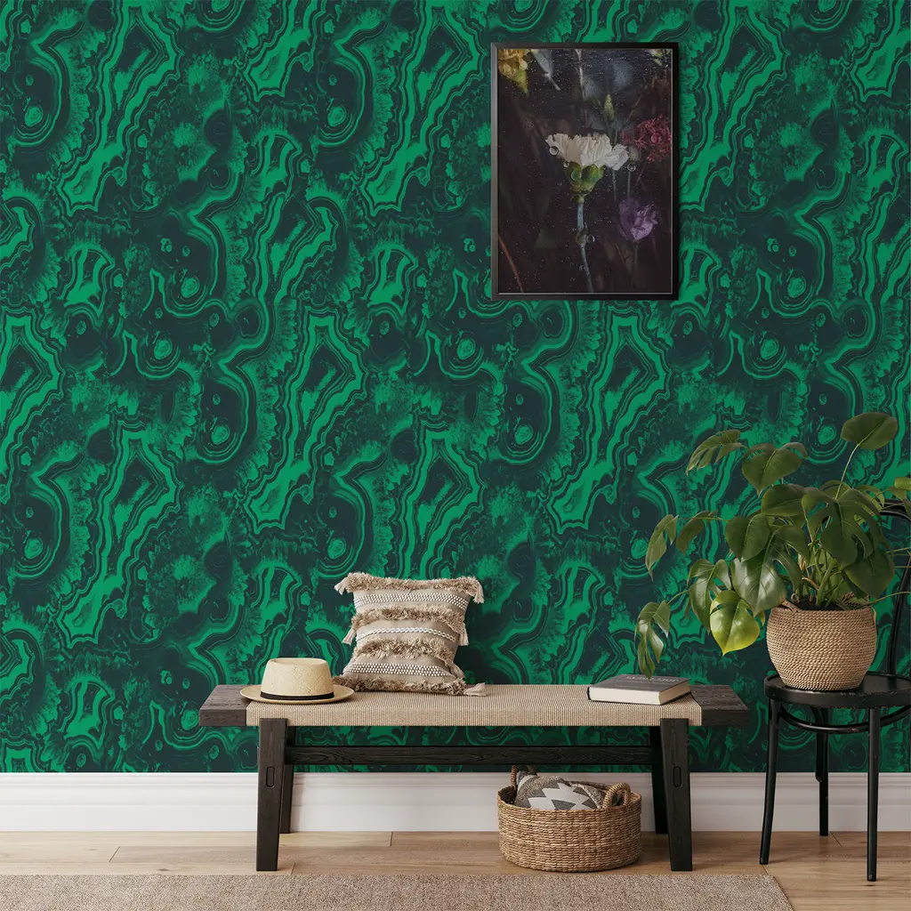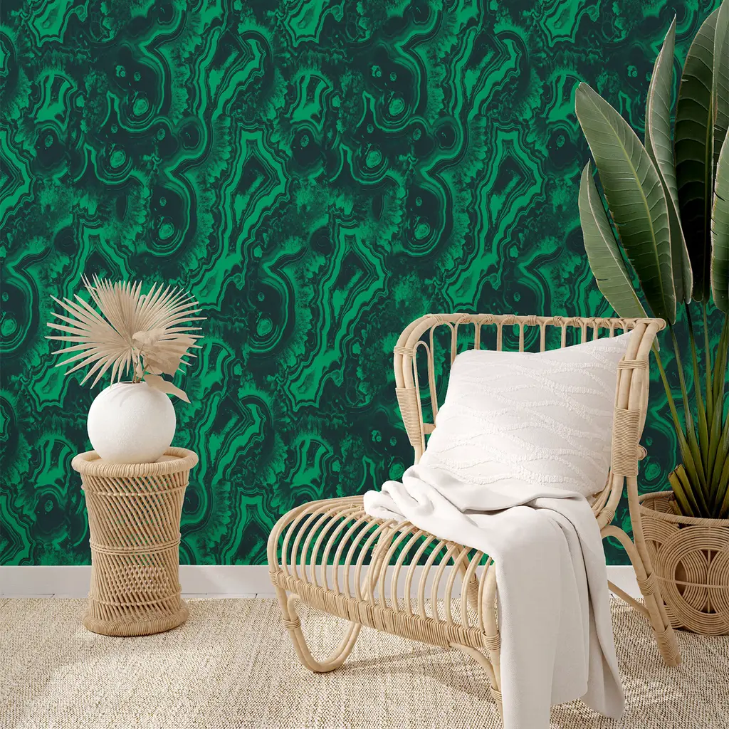 Ecological wallpaper, crafted from vegan water-based inks, designed and printed in Italy using the most advanced technologies. Versatile for walls, shelves, and furniture, it elevates any space. Malachite is famous for its natural beauty. The light and dark streaks give the stone an incomparable charm. Golden furnishing and dark wood are a perfect match. Instructions are included. Each sheet measures 27.5x39.4 inches/70x100 cm, covering a total area of 5 MQ.