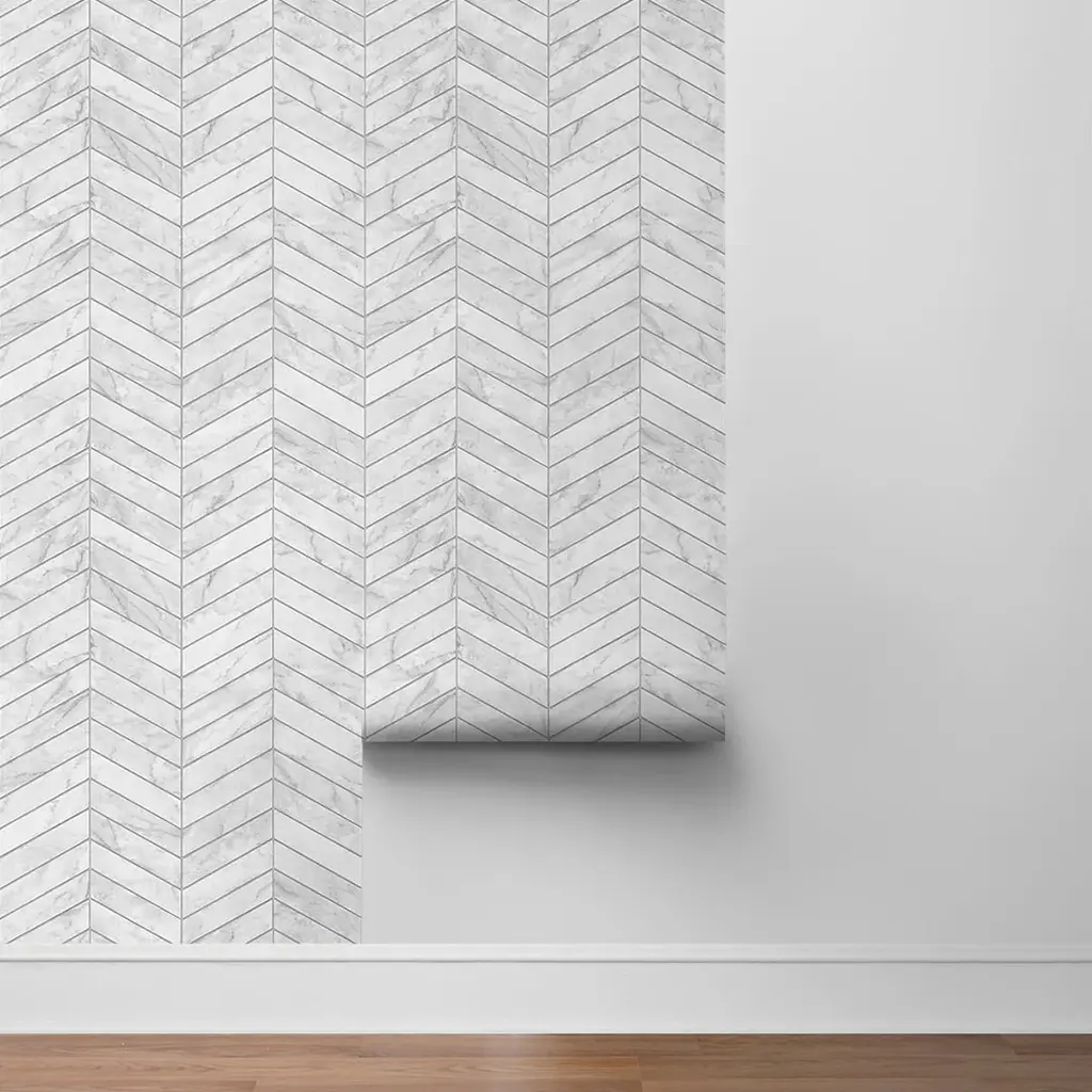 Add a chic and contemporary finish to any kitchen or bathroom setting with this faux Marbled Chevron peel and stick wallpaper from the Luxe Haven collection by Lillian August.Lillian's latest removable wallpaper collection blends her love of color and pattern with casual contemporary styling. Each design is carefully tailored to today's decor trends and is perfect for renters and homeowners looking for an instant, DIY transformation to their interior space. With the same qualities and durability as permanent wallpaper, this product offers an easy, fresh alternative to decorating with very little commitment! Ships In 7-10 Business Days Ships In 7-10 Business Days Ships In 7-10 Business Days Ships In 7-10 Business Days Covers 30.75 sq. ft. per single roll Sold in single rolls Made in the USA Beautiful tile design Please note that we cannot process requests larger than ten samples per client.Please make sure to purchase all of the wallpaper you need at one time. Because our wallpapers are printed in batches, if you purchase at different times we cannot guarantee the new rolls will match your previous rolls.This image is for illustrative purposes only. The colors shown are accurate within the constraints of lighting, photography, and the color accuracy of your screen.