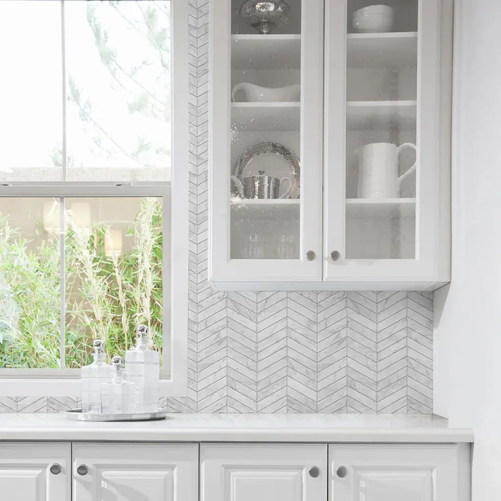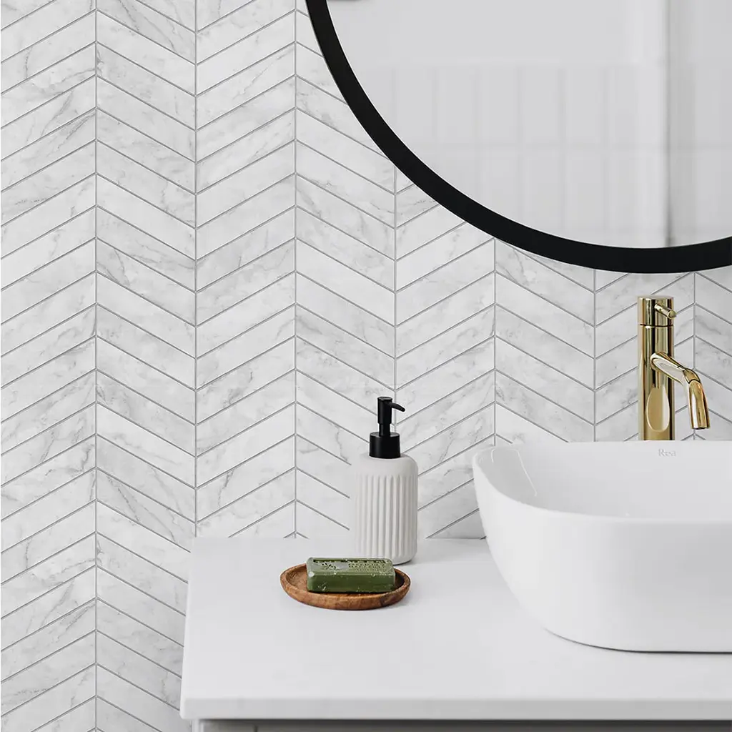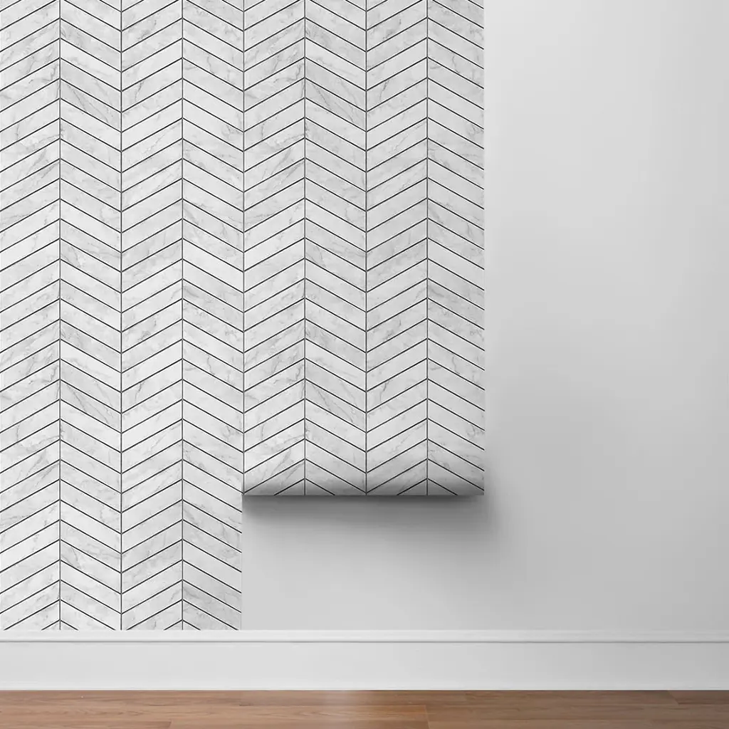 Add a chic and contemporary finish to any kitchen or bathroom setting with this faux Marbled Chevron peel and stick wallpaper from the Luxe Haven collection by Lillian August.Lillian's latest removable wallpaper collection blends her love of color and pattern with casual contemporary styling. Each design is carefully tailored to today's decor trends and is perfect for renters and homeowners looking for an instant, DIY transformation to their interior space. With the same qualities and durability as permanent wallpaper, this product offers an easy, fresh alternative to decorating with very little commitment! Ships In 7-10 Business Days Ships In 7-10 Business Days Ships In 7-10 Business Days Ships In 7-10 Business Days Covers 30.75 sq. ft. per single roll Sold in single rolls Made in the USA Beautiful tile design Please note that we cannot process requests larger than ten samples per client.Please make sure to purchase all of the wallpaper you need at one time. Because our wallpapers are printed in batches, if you purchase at different times we cannot guarantee the new rolls will match your previous rolls.This image is for illustrative purposes only. The colors shown are accurate within the constraints of lighting, photography, and the color accuracy of your screen.
