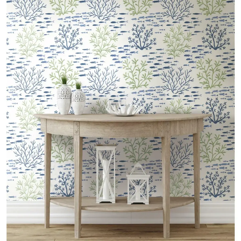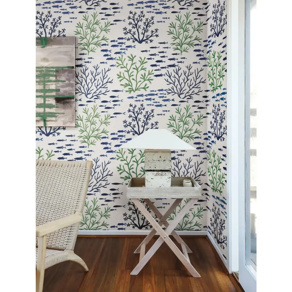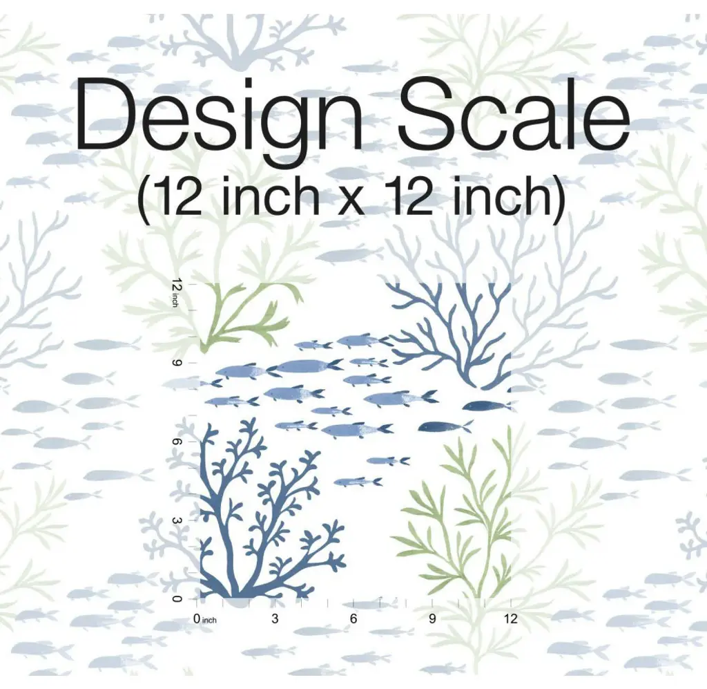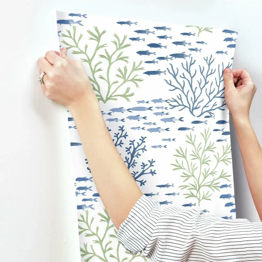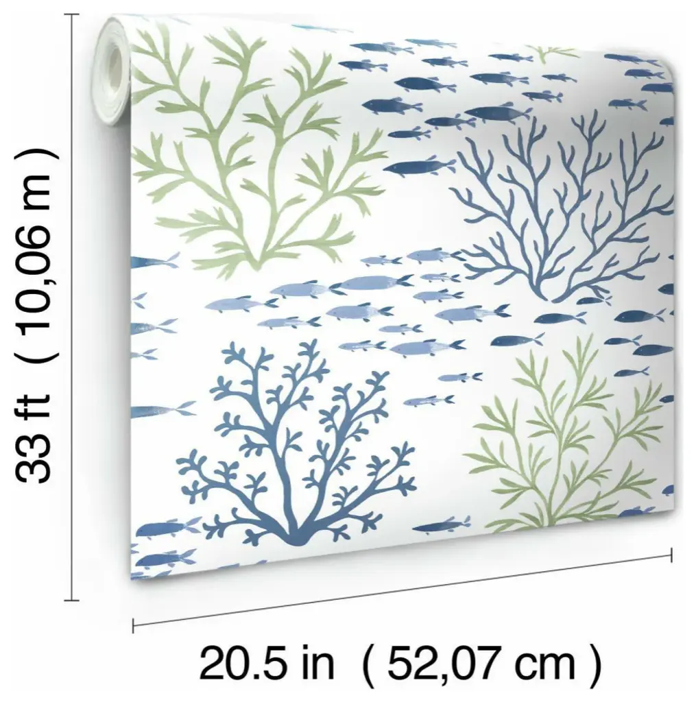 The allure of coastal-chic interiors beckons, with an easy elegance that speaks to the playful pace and casual luxury of living by the water�s edge. Manufactured on Sure Strip�, a unique high performance substrate, this ultra-easy removable wallpaper is guaranteed easy to install and easy to remove; simply use water to activate. Schools of fantastic fish weave through the colorful, coral underwater reef of pattern Marine Garden. Includes 1 roll - 20.5 in x 33 ft = 56 sq ft with a straight match and 52.07 cm repeat.