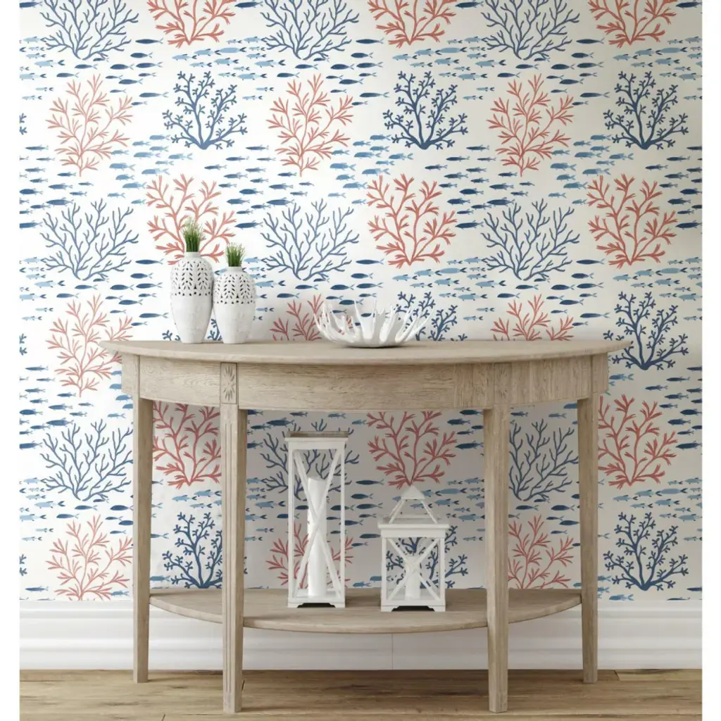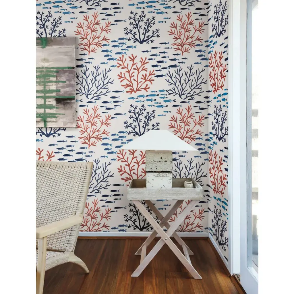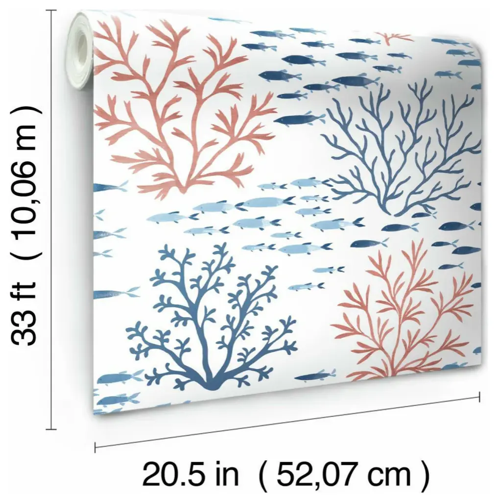 The allure of coastal-chic interiors beckons, with an easy elegance that speaks to the playful pace and casual luxury of living by the water�s edge. Manufactured on Sure Strip�, a unique high performance substrate, this ultra-easy removable wallpaper is guaranteed easy to install and easy to remove; simply use water to activate. Schools of fantastic fish weave through the colorful, coral underwater reef of pattern Marine Garden. Includes 1 roll - 20.5 in x 33 ft = 56 sq ft with a straight match and 52.07 cm repeat.