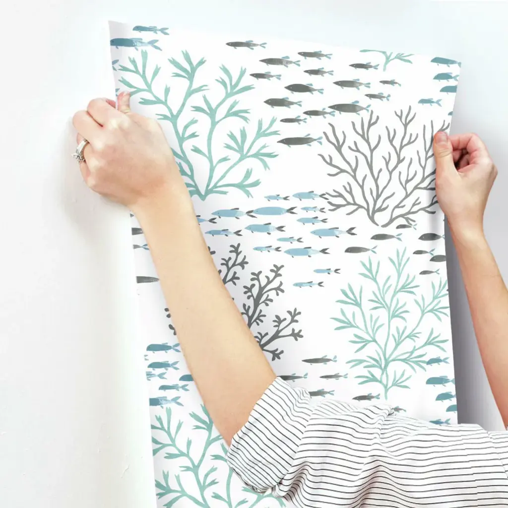 The allure of coastal-chic interiors beckons, with an easy elegance that speaks to the playful pace and casual luxury of living by the water�s edge. Manufactured on Sure Strip�, a unique high performance substrate, this ultra-easy removable wallpaper is guaranteed easy to install and easy to remove; simply use water to activate. Schools of fantastic fish weave through the colorful, coral underwater reef of pattern Marine Garden. Includes 1 roll - 20.5 in x 33 ft = 56 sq ft with a straight match and 52.07 cm repeat.