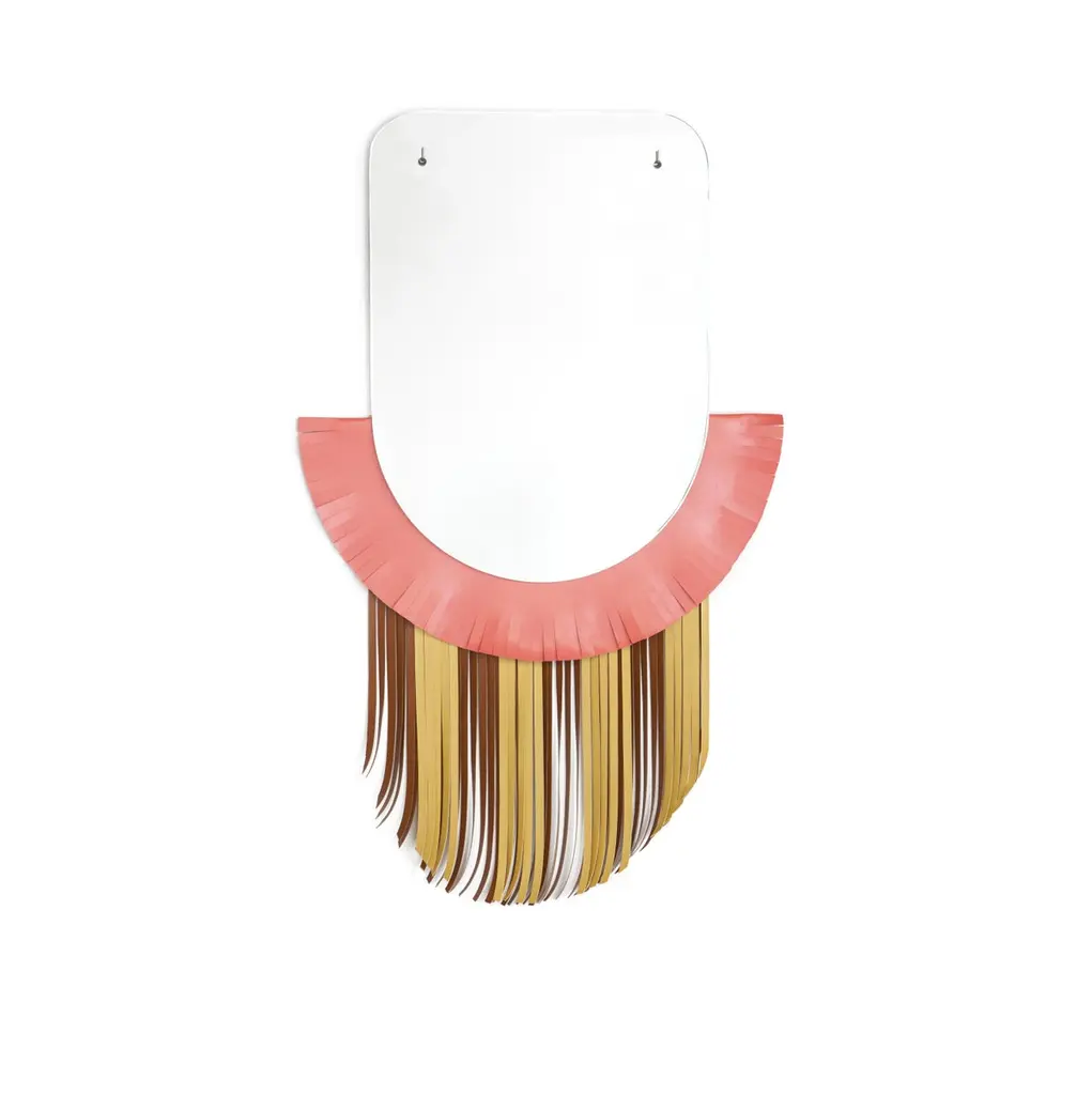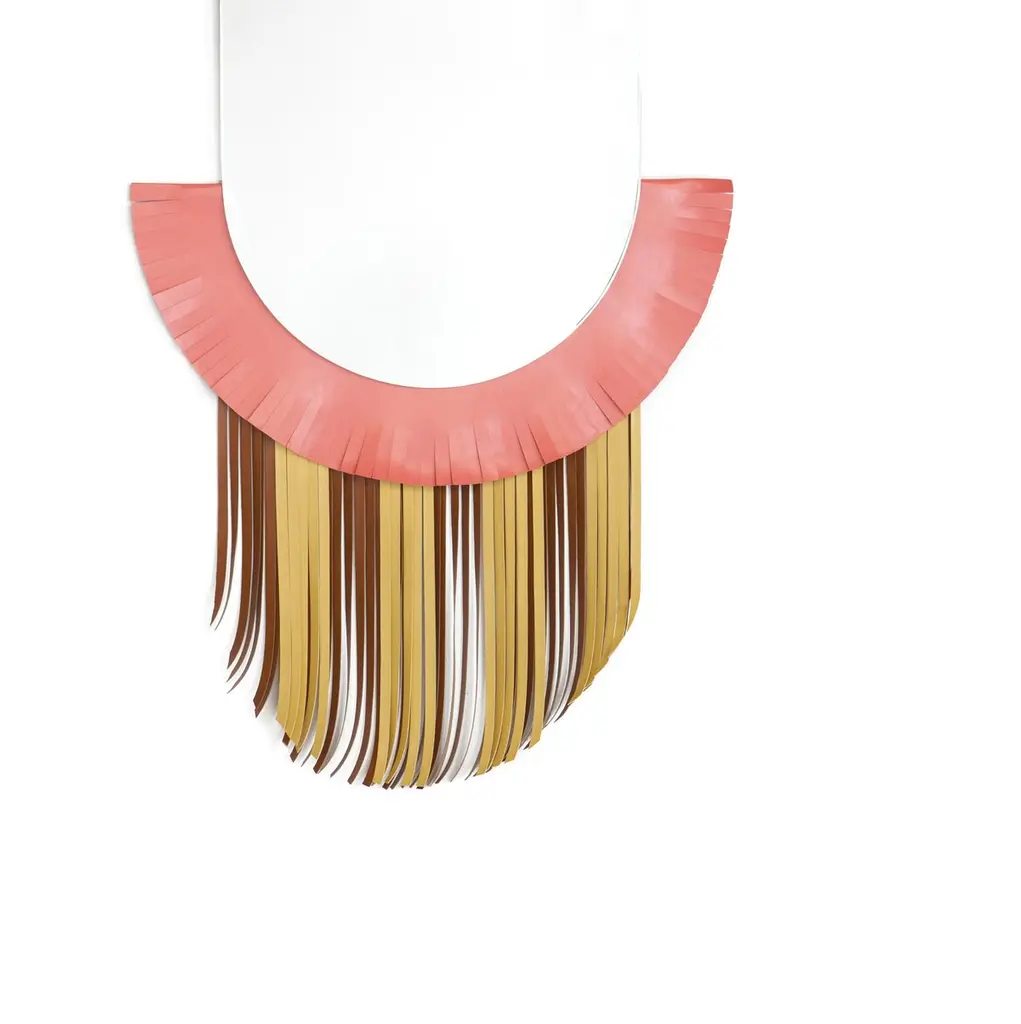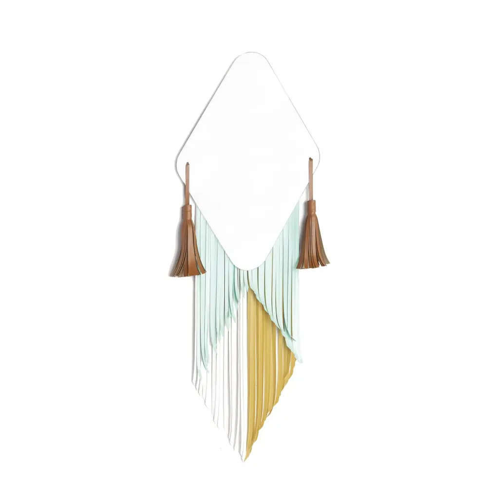 Masai mask mirror by Serena ConfalonieriDimensions: 40 x 55 cmMaterials: Mirror and faux leather decorationsFaux leather colors: Salmon, natural brown and yellowMask shaped mirror with faux leather decorations.Serena Confalonieri (1980) is an independent designer and art director based in Milano. She works on product, graphic and textile design projects and collaborates with many Italian and international companies.Her works are placed in-between product and graphic design: an accurate research on the surfaces is always present in her projects.After a Master Degree in Interior Design, she started her career working in many architecture and design practices in Milano, Barcelona and Berlin, and collaborating with the Interior Design Faculty of Politecnico di Milano as assistant professor.During the years she’s been selected for design residencies and workshops in Italy and abroad (New York, Mexico, Portugal), her works have been published by important newspapers and magazines (The New York Times, Corriere della Sera, Il sole 24 ore, Wallpaper, Interni, Ottagono, L’Officiel, Elle De´COR…) and won prizes such as a Special Mention at the Young & Design Awards 2014 and at the German Design Awards 2016.