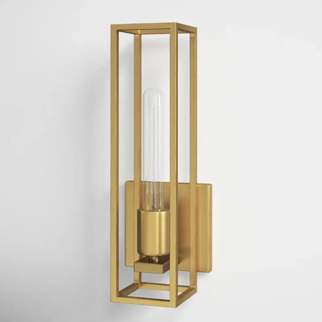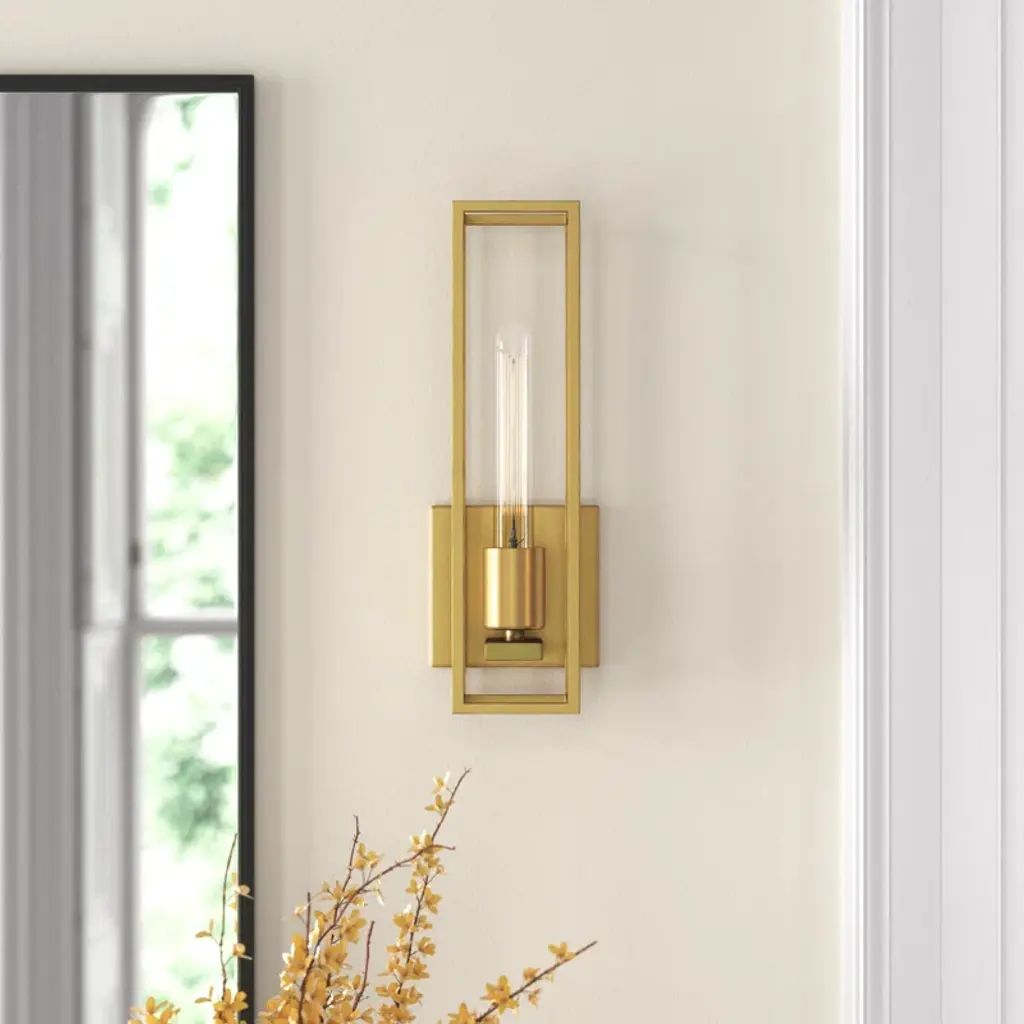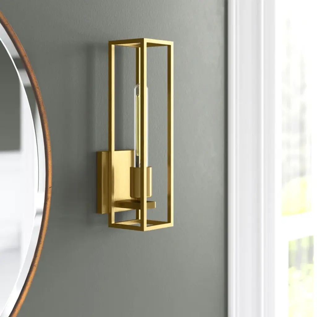 An oblong glass bulb is an ideal companion to this smart, structured bath sconce. It's made from steel and has a weathered brass finish that easily complements white, colored, and even patterned or wallpapered bathroom walls. The square backplate sets the tone for the airy, angular rectangular frame, inside of which houses a single bulb of up to 100W (sold separately). This hardwired fixture is safe to use in damp locations and compatible with dimmer switches, so it's great for setting the mood for steamy showers, relaxing baths, and all the moments in between.