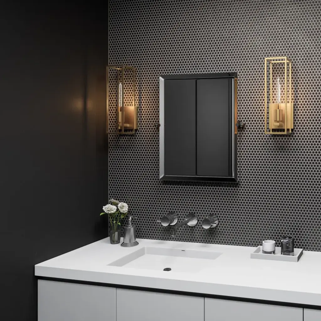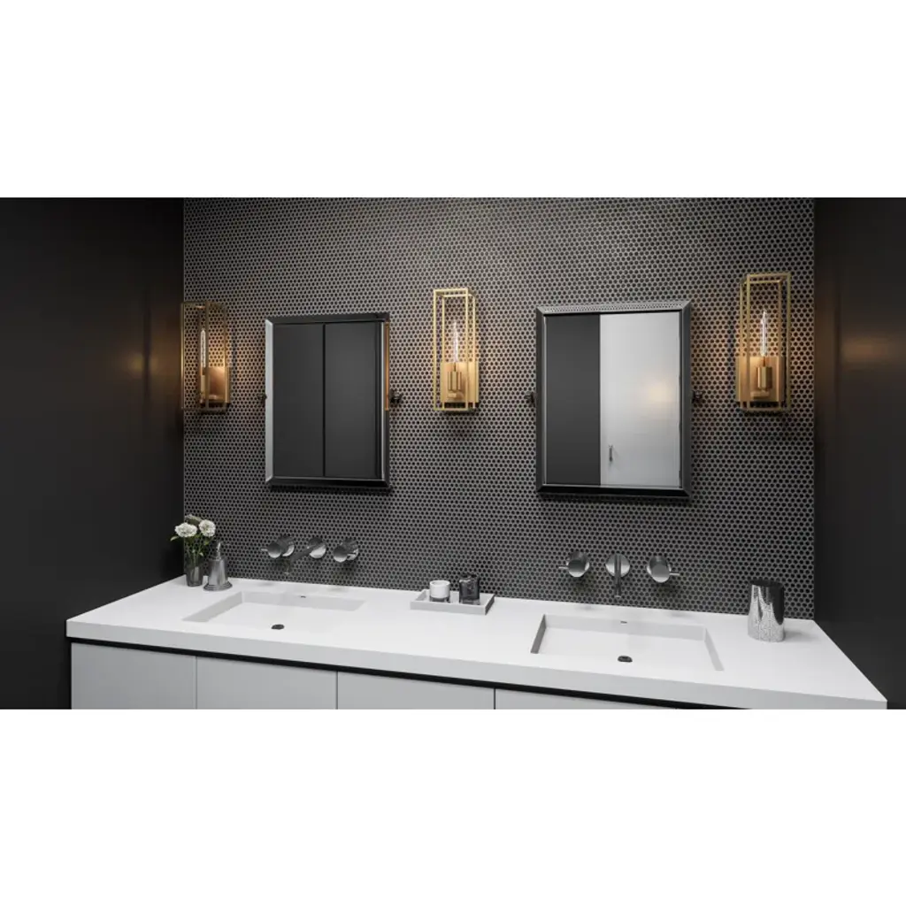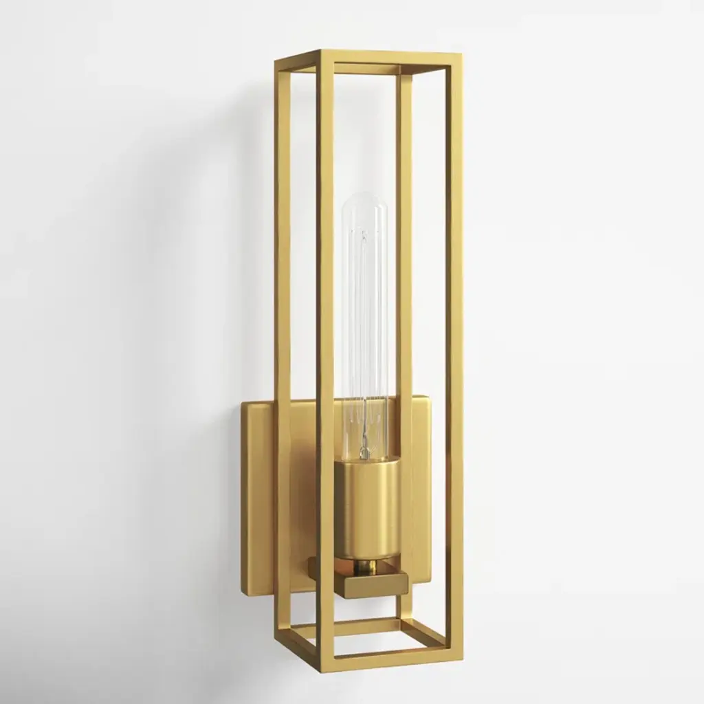 An oblong glass bulb is an ideal companion to this smart, structured bath sconce. It's made from steel and has a weathered brass finish that easily complements white, colored, and even patterned or wallpapered bathroom walls. The square backplate sets the tone for the airy, angular rectangular frame, inside of which houses a single bulb of up to 100W (sold separately). This hardwired fixture is safe to use in damp locations and compatible with dimmer switches, so it's great for setting the mood for steamy showers, relaxing baths, and all the moments in between.