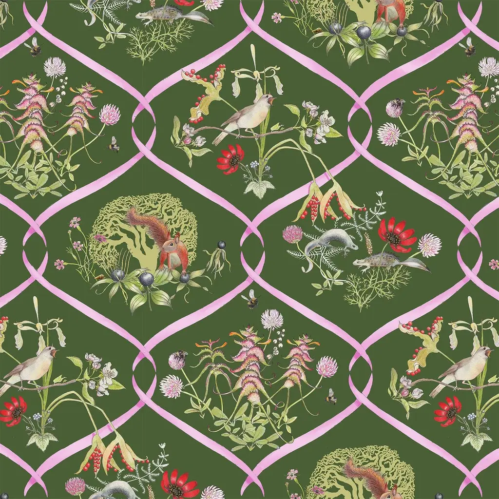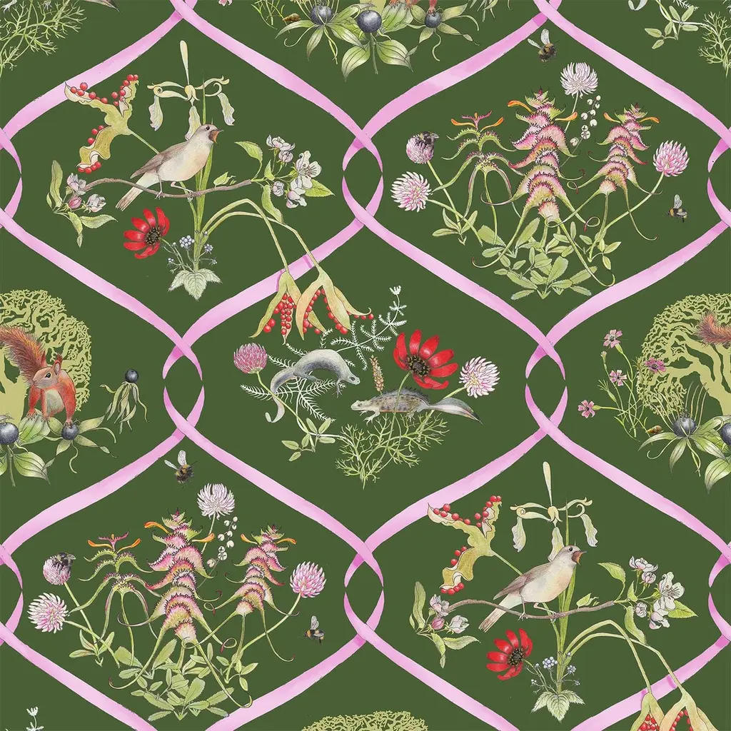 Collection: English Mercia: Mercia RibbonsProduct Code: 29Color: SlateRoll dimensions: 70cm x 10m (27.6in x 10.9yards)Area: 7sq.m (8.4 sq.yards)Pattern repeat: StraightWallpaper: Non-woven 147gsm UncoatedFire rating: Fire certified for both Europe and the USA. Classified to BS En 13501-1-1:2002, class B, s1, d0Wallpaper: The designs are printed on Uncoated Non-woven 147gsm. This design will also be available on Coated Non-woven 147gsm. The uncoated wallpaper has a matt finish and vibrant but gentle, muted colours. The Coated wallpaper has a slight shine, is more wipeable and has deeper colours.Fire rating: Fire certified for both Europe and the USA. Classified to BS En 13501-1-1:2002, class B, s1, d0This pattern shows English species suggested to me by the imaginary species in Dr Suess's The Lorax. It is organised in an ogee pattern, made of ribbons. They remind me of the double helix of the DNA that determines how we all turn out, every living thing, and of chain link fences, and breaking through them to get out into nature.The humming fish are represented by great crested newts, the precious truffula trees are clover flowers whilst the playful barballoots are the red squirrels. The bees which also feature in a companion print are short-haired bumblebees – a wonderful conservation success story as they were extinct in the UK but acres of flower-rich meadows were planted in Kent, the bees were reintroduced and are now thriving. Other flowers include several species of clover, Pheasant’s eye, crested cowwheat, Stinking iris, whorled millifoil, Carthusian pinks, Herb Paris,wintergreen and blossoms of a rare old English breed of apple. Great great grandfather snail is the lagoon spire snail (thought extinct, but recently found in Chichester harbour). Companion prints include Mercia Vines and Mercia Bees, featuring details from this design.This is an eco-friendly fine gicleé digitally-printed “real” wallpaper. It is printed in the UK on a natural non-woven cellulose-based substrate made from recycled materials, recycled polyester (PET) fibre and recycled wood pulp. The production process is solvent free with minimal waste and energy inputs.