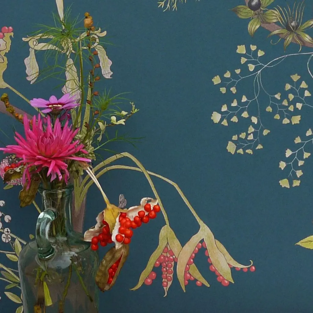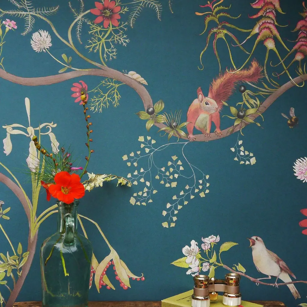 Collection: Mercia VinesProduct Code: 28CColors: BlueRoll dimensions: 70cm x 10m (27.6in x 10.9yards)Area: 7sq.m (8.4 sq.yards)Pattern repeat: 70cm (27.6in) Three Quarter DropWallpaper: Non-woven 147gsm Can be produced as Coated or Uncoated. Fire rating: Fire certified for both Europe and the USA. Classified to BS En 13501-1-1:2002, class B, s1, d0The English Mercia collection is Susy's tribute to one of the greatest conservation parables ever written, The Lorax by Dr Seuss. The species in the design are based on real world English equivalents of the imaginary species that feature in the Lorax story – inhabiting the region of the ancient kingdom of Mercia. The humming fish are represented by great crested newts; the precious truffula trees are clover flowers whilst the playful barballoots are the red squirrels. The bees, which also feature in a companion print are short-haired bumblebees – a wonderful conservation success story as they were extinct in the UK but acres of flower-rich meadows were planted in Kent, the bees were reintroduced and are now thriving. A flowing and joyful pattern, riffing on traditional flowing tree of life designs in an original, contemporary, botanical interpretation. It has an enchanting meandering feel, and is part of a growing passion in interiors for honouring the natural world. Furthermore, for every roll of wallpaper sold, 100m2 of critical wild Habitat is preserved through World Land Trust.This is an eco-friendly Fine gicleé digitally-printed “real” wallpaper. It is printed in the UK on a natural non-woven cellulose-based substrate made from recycled materials – recycled polyester (PET) fibre and recycled wood pulp. The production process is solvent free with minimal waste and energy inputs.