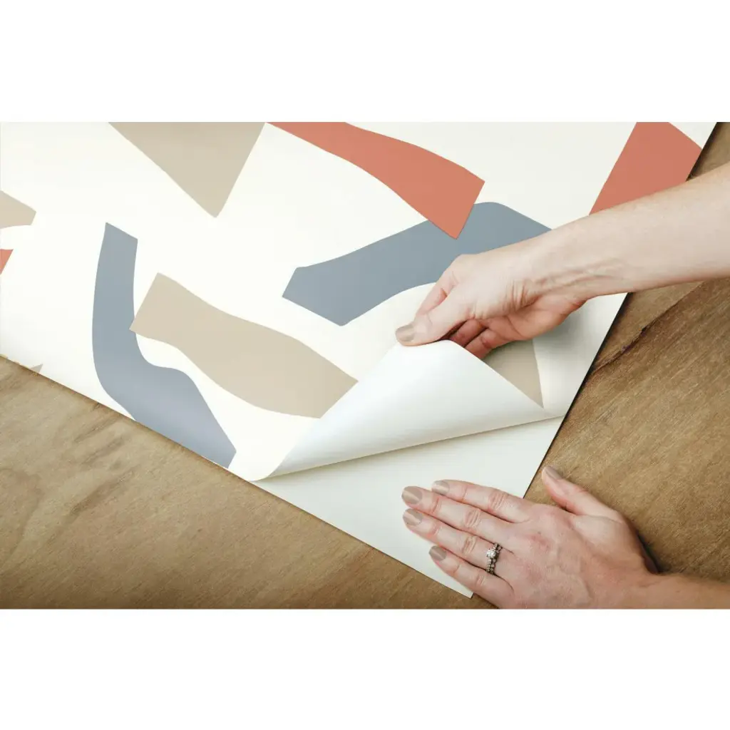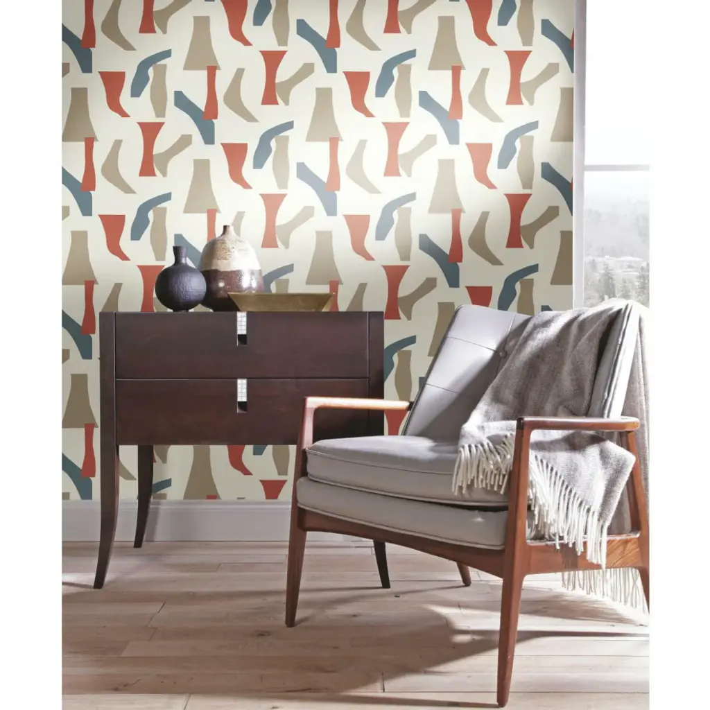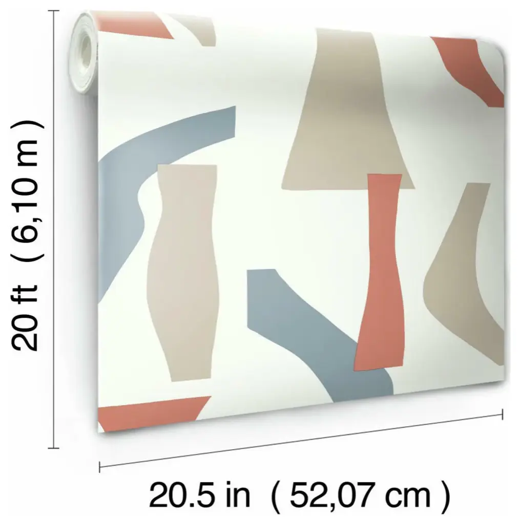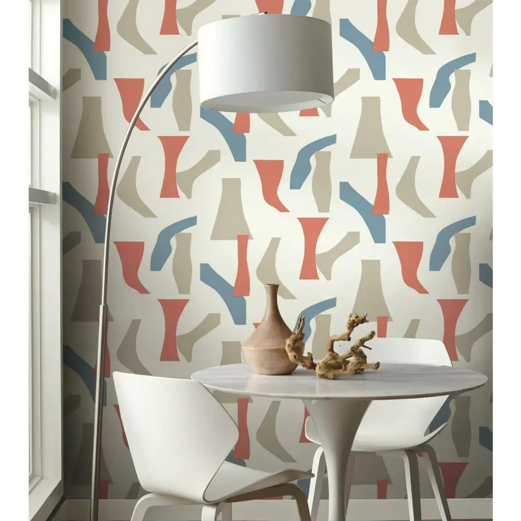 This product is a superior luxury non-woven peel and stick wallpaper, which removes easily in full strips without damage to surfaces. Colorful, deconstructed sculptural shapes bring a fresh perspective to artistic form in this Modernist wallpaper. Includes 1 roll - 20.5 in x 20 ft = 34.17 sq ft with a drop match and 24 in repeat.