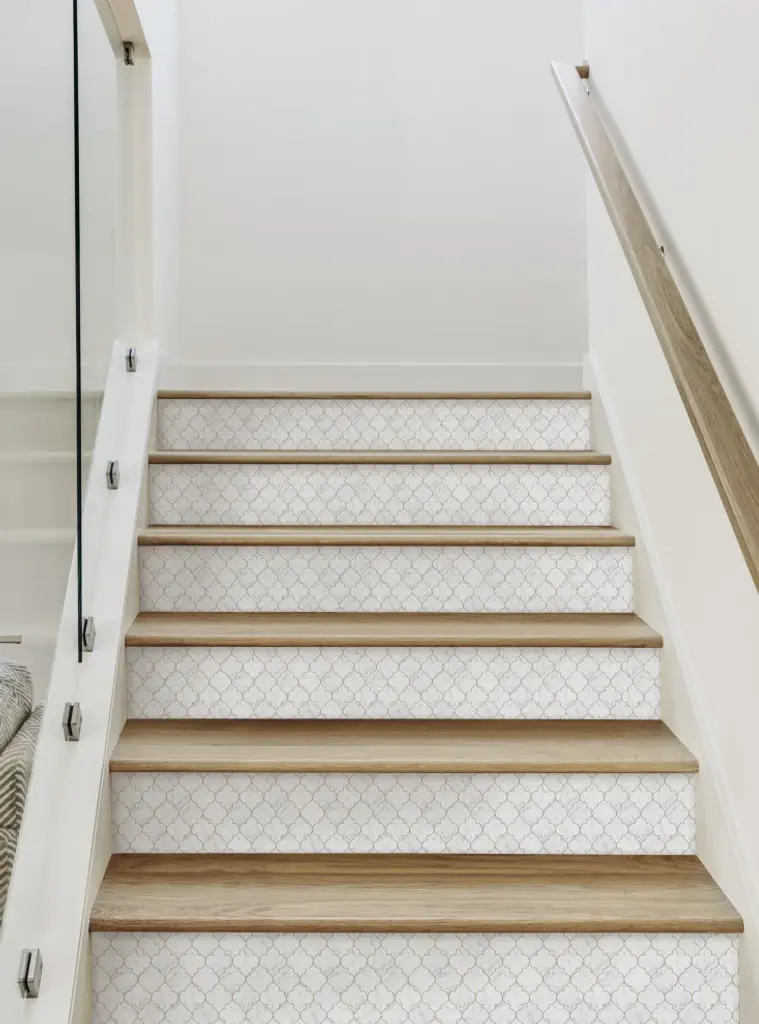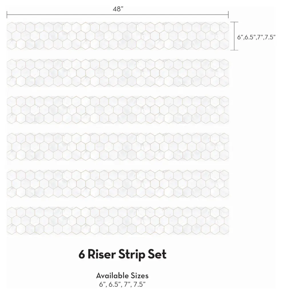 Create an elegant, modern look on your stairs with our Moroccan Marble Stair Riser Strips! Printed on premium adhesive backed fabric, this geometric design will accentuate your staircase and add a touch of class to any room. DIY decorating has never been easier with this repositionable vinyl that can be easily applied and removed without any stress or mess!This re-positionable wallpaper is designed and made in our studios in New Jersey. The designs are printed onto an adhesive-backed vinyl that can be removed, repositioned, and reused. The wallpaper does not leave residue on your walls and is ideal for DIY room makeovers without the mess and headaches of traditional wallpaper.Sizes:48"w x 6"h48"w x 6.5"h48"w x 7"h48"w x 7.5"hWhat''s Included6 sheets of peel-n-stick vinyl stair riser strips