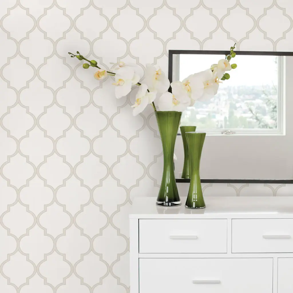 Our classic Moroccan Peel-and-Stick Vinyl Wallpaper is available in many color options and complements every room in the house! Please see the close-up image to view the two-toned pattern.This re-positionable wallpaper is designed and made in our studios in New Jersey. The designs are printed onto an adhesive-backed vinyl that can be removed, repositioned, and reused. The wallpaper does not leave residue on your walls and is ideal for DIY room makeovers without the mess and headaches of traditional wallpaper.Size:24"w x 60"h24"w x 108"hPattern Repeat Length:every 8" What''s Included:1 sheet of peel-n-stick vinyl wallpaper