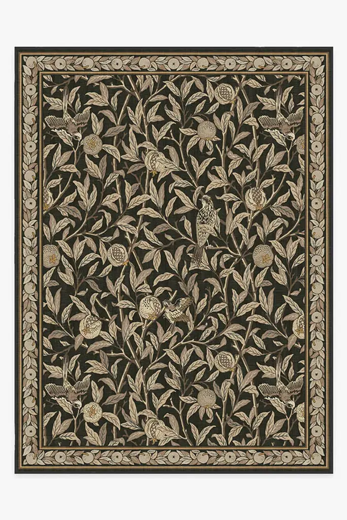 Let your room sing with our Morris & Co. Bird & Pomegranate Soft Black Rug. We've transformed the 1926 wallpaper design into a charming vignette with a modern, playful border. Originally inspired by views from William Morris's personal home, this whimsical scene features birds swooping, perching, and pecking amidst a maze of pomegranate plants. The composition features moody contrasted black, browns, gold and desaturated neutrals for a more subdued feel. Water-resistant, stain-resistant, and machine-washable. Rug colors may vary slightly according to your device and the lighting in your space.