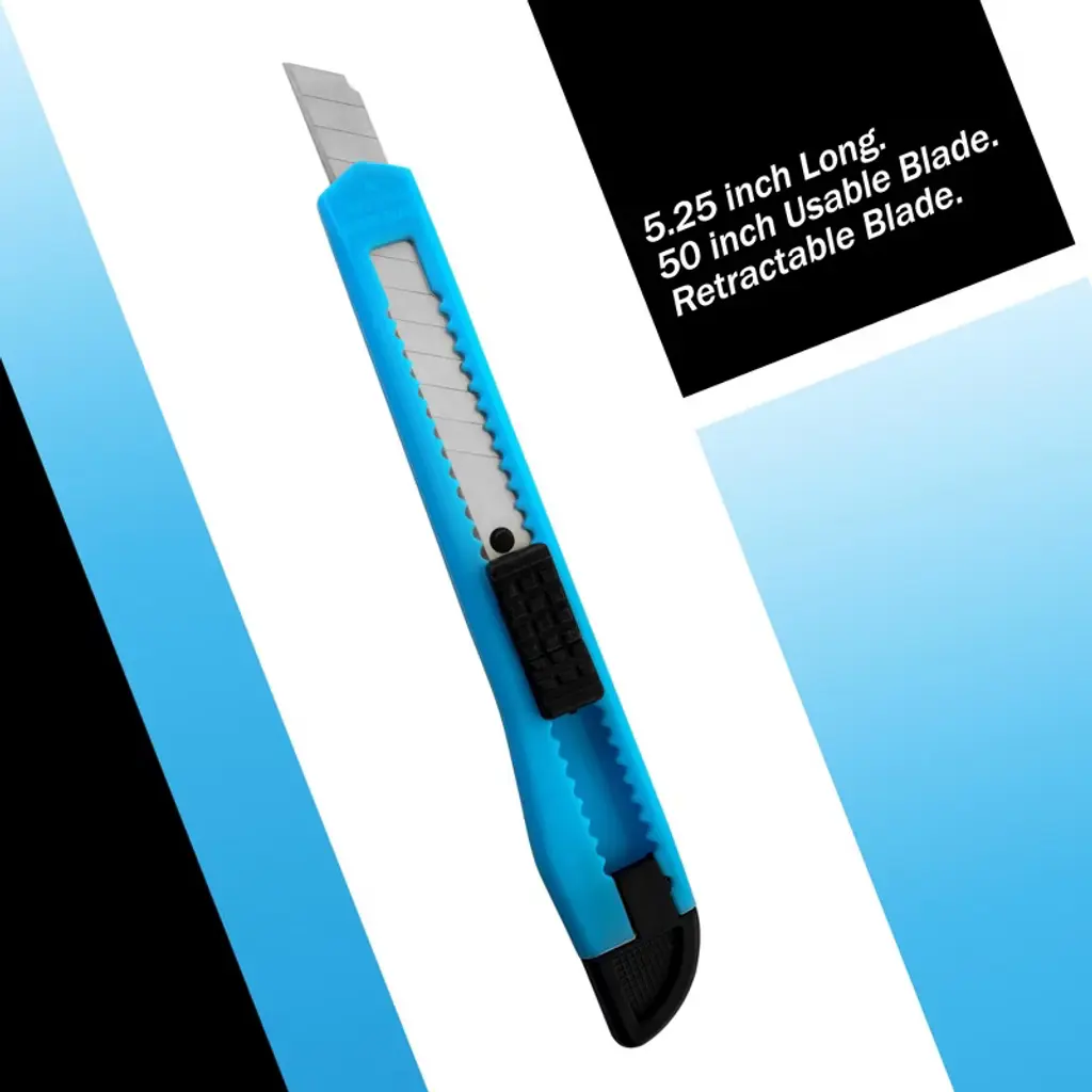 Our utility knife retractable box cutter is an excellent addition to any home, toolbox, or junk drawer. Whether you're opening a package or slicing through something tough, these crafting supplies are the perfect tool for the job. It uses a removable razor blade to cut, so the edge is both razor-sharp and disposable. Ideal for all of the grunt-work cutting jobs that are too difficult for scissors and too dulling and damaging for a nice pocket knife. Think of it as a lighter version of the box cutter, only stronger and can cut tougher materials. With this breakaway snap-off box cutter, a new point and sharp edge are always just a snap away. This retractable craftsman utility knife has a durable plastic body and segmented blades that snap off. This keeps the blades sharp for precise cutting and saves you a lot of time on your projects because you can just snap off the blade between uses. Simply use the cutter's detachable black end to snap off the blade. Great for cutting paper, wallpaper, contact paper, cardboard, vinyl, carpet, twine, and other materials. It's the perfect tool to always have on hand at home, in the garage, in the office, or in the warehouse. The blade can also be replaced. Simply push the button to the top, pull off the used blade, then push the button back to the bottom, then push up, and the blade will self-reload. The case is made of soft TPR material with an ergonomic finish that makes it easy to hold and makes it easier to work for long periods of time. Ideal for everyday use and craft projects. So, if you're looking for a cutter that can handle anything you throw at it, then our utility knife cutter is the perfect choice. NOTE: Each order is for ONE HUNDRED (100) knives.