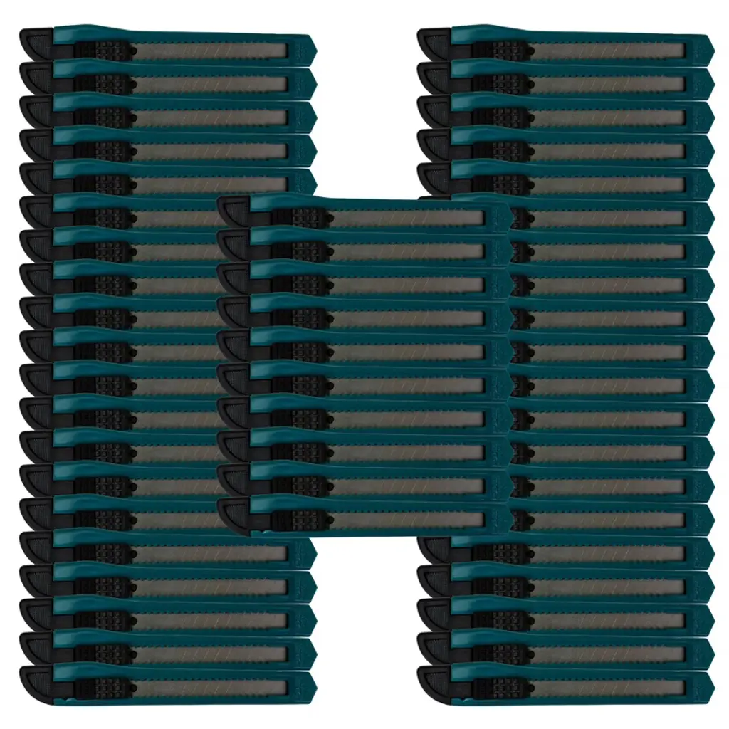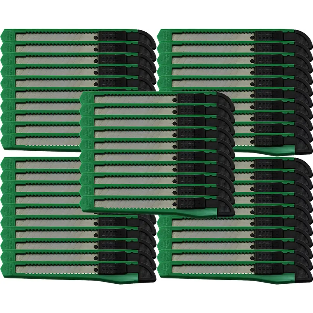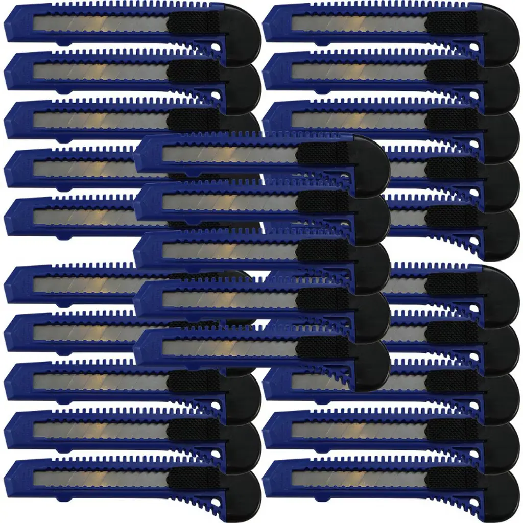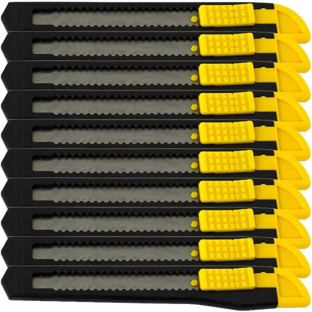 Our utility knife retractable box cutter is an excellent addition to any home, toolbox, or junk drawer. Whether you're opening a package or slicing through something tough, these crafting supplies are the perfect tool for the job. It uses a removable razor blade to cut, so the edge is both razor-sharp and disposable. Ideal for all of the grunt-work cutting jobs that are too difficult for scissors and too dulling and damaging for a nice pocket knife. Think of it as a lighter version of the box cutter, only stronger and can cut tougher materials. With this breakaway snap-off box cutter, a new point and sharp edge are always just a snap away. This retractable craftsman utility knife has a durable plastic body and segmented blades that snap off. This keeps the blades sharp for precise cutting and saves you a lot of time on your projects because you can just snap off the blade between uses. Simply use the cutter's detachable black end to snap off the blade. Great for cutting paper, wallpaper, contact paper, cardboard, vinyl, carpet, twine, and other materials. It's the perfect tool to always have on hand at home, in the garage, in the office, or in the warehouse. The blade can also be replaced. Simply push the button to the top, pull off the used blade, then push the button back to the bottom, then push up, and the blade will self-reload. The case is made of soft TPR material with an ergonomic finish that makes it easy to hold and makes it easier to work for long periods of time. Ideal for everyday use and craft projects. So, if you're looking for a cutter that can handle anything you throw at it, then our utility knife cutter is the perfect choice. NOTE: Each order is for FIFTEEN (15) knives.