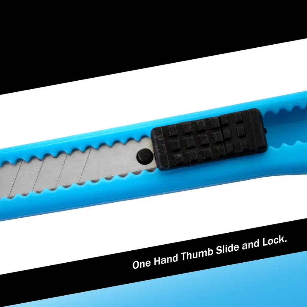 Our utility knife retractable box cutter is an excellent addition to any home, toolbox, or junk drawer. Whether you're opening a package or slicing through something tough, these crafting supplies are the perfect tool for the job. It uses a removable razor blade to cut, so the edge is both razor-sharp and disposable. Ideal for all of the grunt-work cutting jobs that are too difficult for scissors and too dulling and damaging for a nice pocket knife. Think of it as a lighter version of the box cutter, only stronger and can cut tougher materials. With this breakaway snap-off box cutter, a new point and sharp edge are always just a snap away. This retractable craftsman utility knife has a durable plastic body and segmented blades that snap off. This keeps the blades sharp for precise cutting and saves you a lot of time on your projects because you can just snap off the blade between uses. Simply use the cutter's detachable black end to snap off the blade. Great for cutting paper, wallpaper, contact paper, cardboard, vinyl, carpet, twine, and other materials. It's the perfect tool to always have on hand at home, in the garage, in the office, or in the warehouse. The blade can also be replaced. Simply push the button to the top, pull off the used blade, then push the button back to the bottom, then push up, and the blade will self-reload. The case is made of soft TPR material with an ergonomic finish that makes it easy to hold and makes it easier to work for long periods of time. Ideal for everyday use and craft projects. So, if you're looking for a cutter that can handle anything you throw at it, then our utility knife cutter is the perfect choice. NOTE: Each order is for FIVE (5) knives.