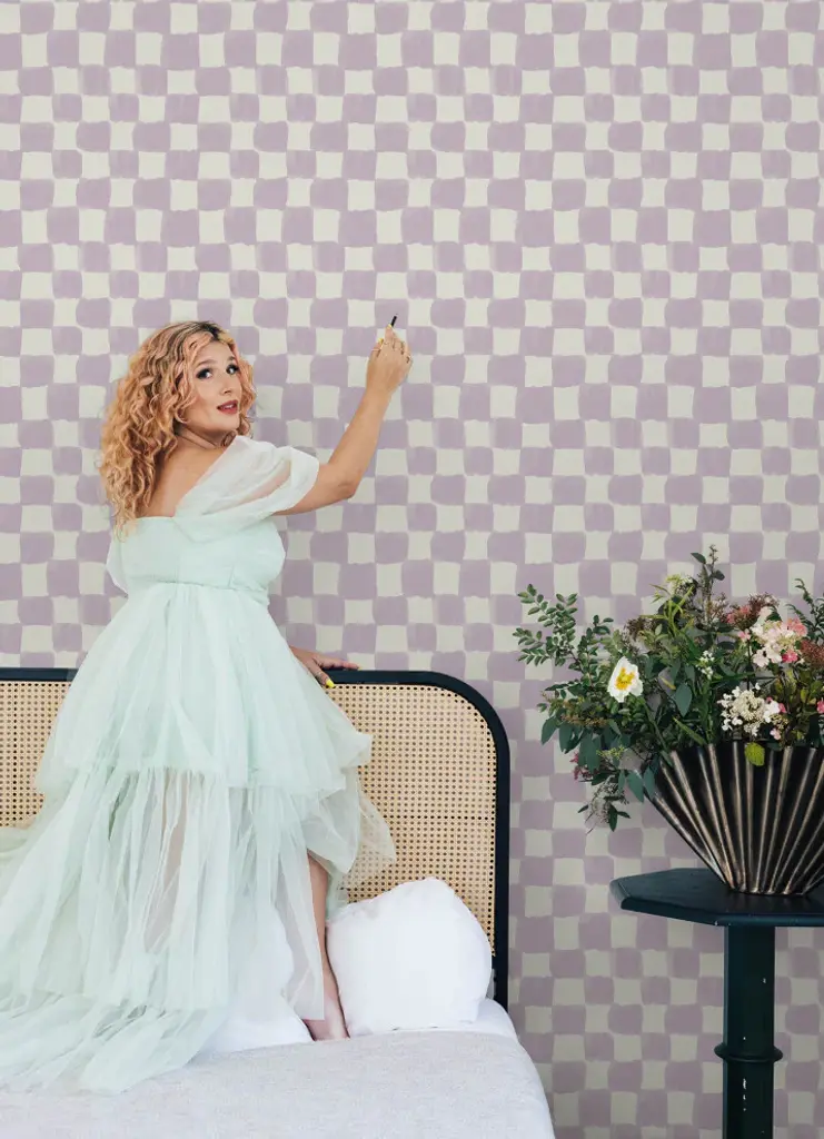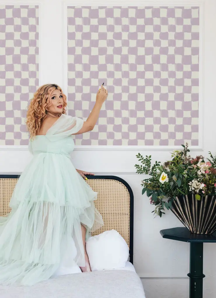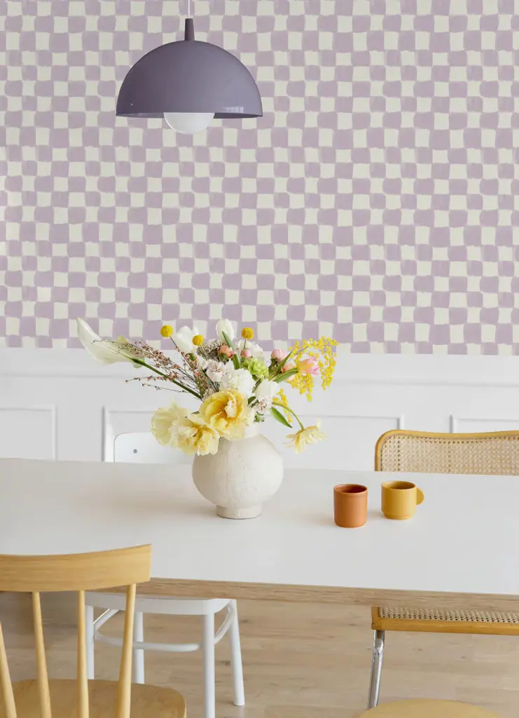 Embrace a little bit of whimsy with this watercolor checkerboard pattern, hand drawn by Mr. Kate. This funky geometric adds a pop of color and playfulness to any space in just Peel, Stick Done! Tess Watercolor Soft Lavender Checker Peel and Stick Wallpaper comes on one roll that measures 20.5 inches wide by 18 feet long. Hand-drawn purple and white checkerboard peel and stick wallpaper designed by Mr. Kate; Peel and stick to apply, pull up to remove; Mr. Kate x RoomMates Peel and Stick Wallpaper is safe for walls and leaves no sticky residue behind; Easily repositionable while installing; Mr. Kate x RoomMates Peel and Stick Wallpaper sticks to any smooth, flat surface - perfect for DIY projects; Ideal for rental or home decorating;Comes on a 20.5-in x 18-ft roll and covers about 30.8 sq. ft;Design repeat of 20.5-in;.