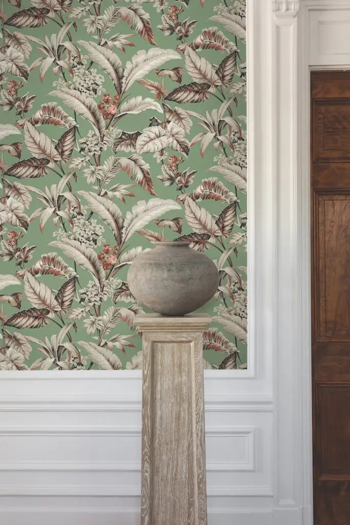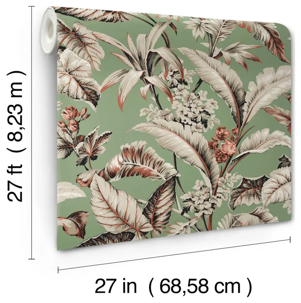 The tropical fronds, flowers, and foliage of Mystic Isle inspire images of international travel and a luxury lifestyleshown in neutral beige and rust on sage green. This Mystic Isle Wallpaper measures approximately 27 inches wide by 27 feet long, measuring approximately 60.8 square feet per roll. The distinction of timeless style. Unpasted non woven material. 25.25-in repeat, drop match. Washable and strippable. 27-in by 27-ft long roll. Covers about 60.8 square feet