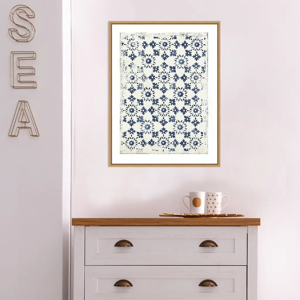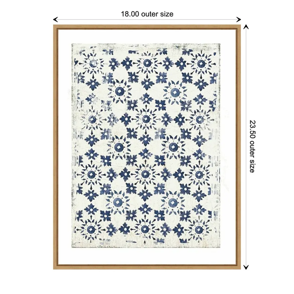 Add some vintage charm with this painting of a pattern. This could be a tablecloth, wallpaper or some other pattern, offering a touch of Americana. The fading in and out adds depth to this wall decor piece.Features:FLOAT FRAMED CANVAS ART: Canvas is framed in a floated style that showcases a narrow gap between the edge of the gallery wrapped canvas and the frame. The wrapped canvas appears as if it's "floating" on the frame. The overall look is clean, modern and upscale.QUALITY: Canvas is printed with high quality, fade-resistant inks and stretched to hide corner folds. Canvas is stretched across a solid surface to resist sagging.AUTHENTICITY: Canvas is printed and professionally framed in Madison, Wisconsin USA with authentically licensed artwork.EFFORTLESS HANGING: Ready to hangfor easy installation. The metal sawtooth hangers come attached on the inset back for easy wall display.CUSTOM PACKAGED: Canvas is custom packaged for protection in shipment to arrive without damage.Details:Artist: Aimee WilsonTitle: Navy Geo IIIProduct type: Framed Canvas BoxStyle: Modern ContemporaryFormat: portraitSize: MediumSubject: OtherFrame: Sylvie Maple .5"Image dimensions: 22 inches high x 16.50 inches wideOutside dimensions: 23.50 inches high x 18 inches wide x 1.875 inches deep