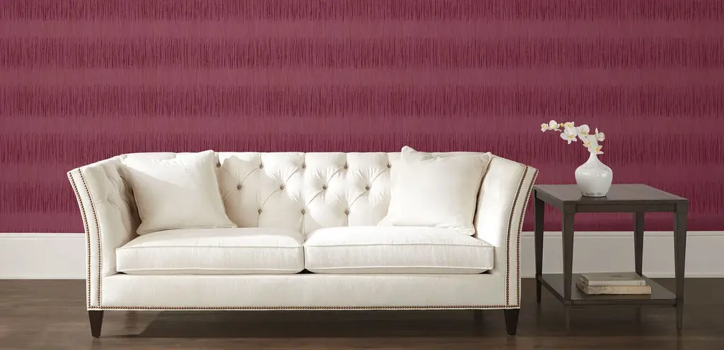 In two shades of red, vertical marks with a hand-drawn look form contrasting horizontal bands. This striped wallpaper is a moody addition to formal spaces like the dining room or sitting room.